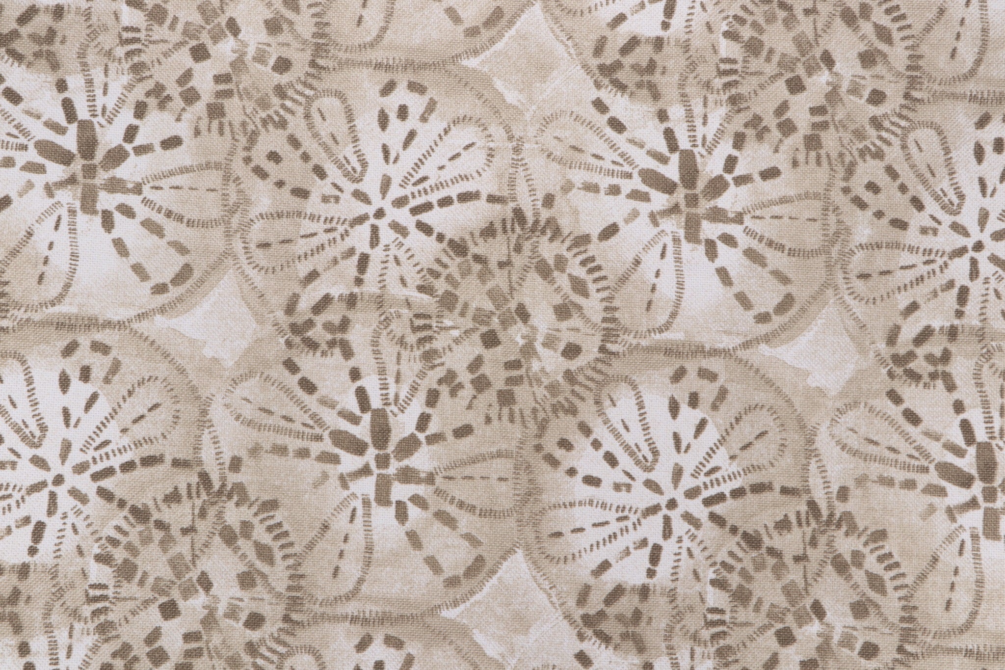 DESCRIPTION: Lacefield Designs Sand Dollar Fabric in Sand a repeating, hand-drawn sand dollar pattern in golden beige and taupe colors on a cream or light beige background.