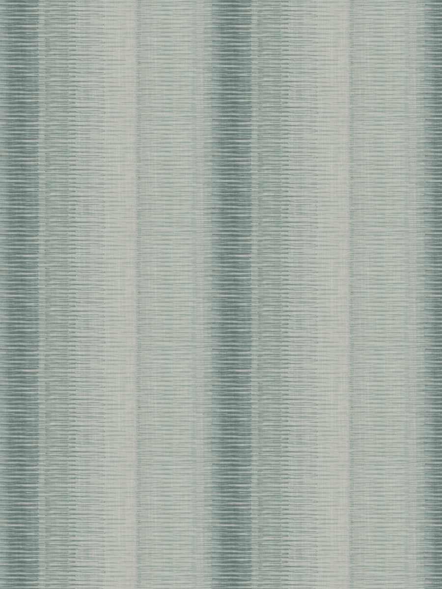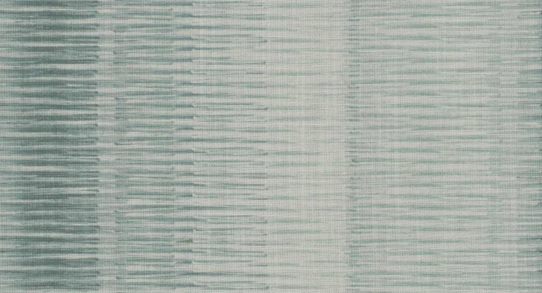 DESCRIPTION: Lowell Ikat Stripes Fabric in Aqua features horizontal stripes with a "ikat" style, meaning the edges of the stripes appear feathered or blurred. The density and color of the stripes vary across the width, creating an ombre effect that transitions from a darker, more solid band on the left to lighter, more sparse stripes on the right. The primary colors are various shades of seafoam green, washed jade, aloe, on a white background.