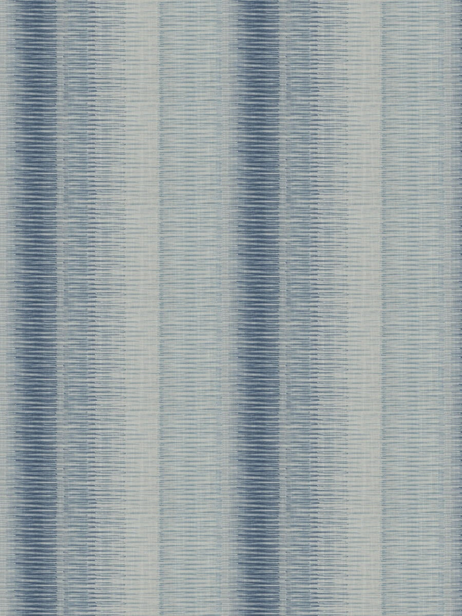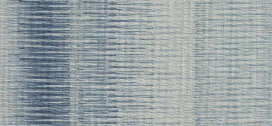 DESCRIPTION: Lowell Ikat Stripes Fabric in Indigo features horizontal stripes with a "ikat" style, meaning the edges of the stripes appear feathered or blurred. The density and color of the stripes vary across the width, creating an ombre effect that transitions from a darker, more solid band on the left to lighter, more sparse stripes on the right. The colors range from a deep, saturated blue to much lighter shades of blue on a white colored background.