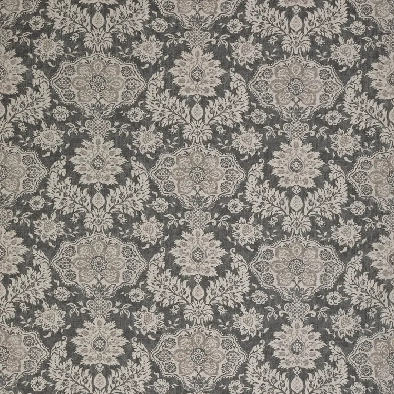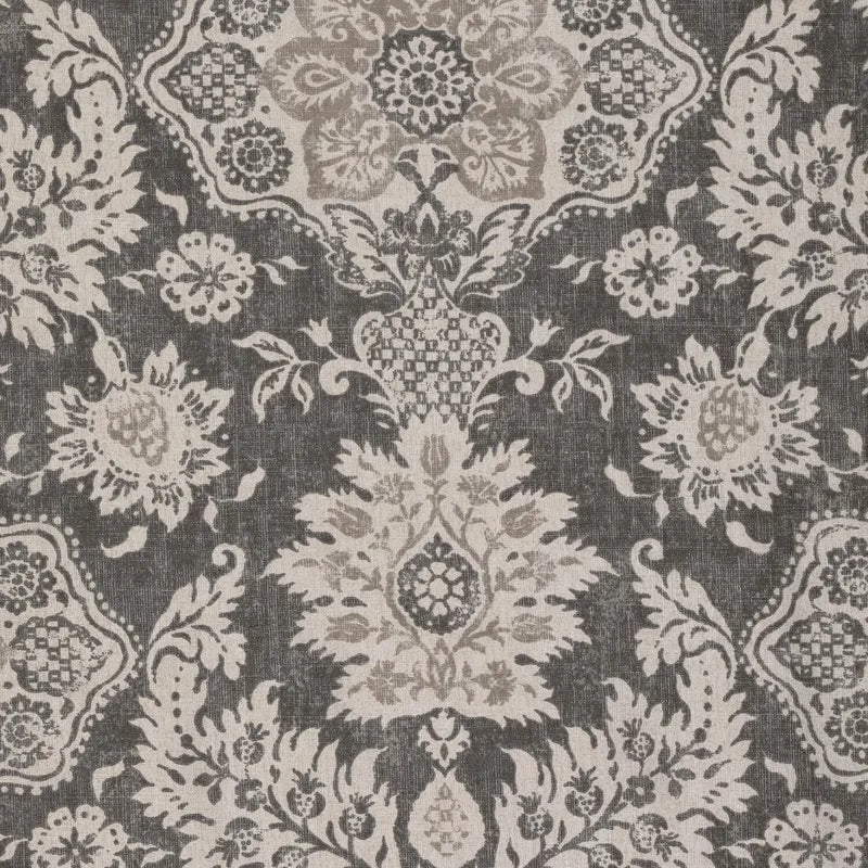DESCRIPTION:  Magnolia Home Belmont Fabric in Metal is a sophisticated damask pattern with an intricate floral, leaves, and pods design with a vintage-look. It also incorporates a medallion design and has a subtle aged or framed appearance.  The color scheme primarily features shades of grey (including stone grey and sterling grey), soft white, cream, and khaki or natural tones.
