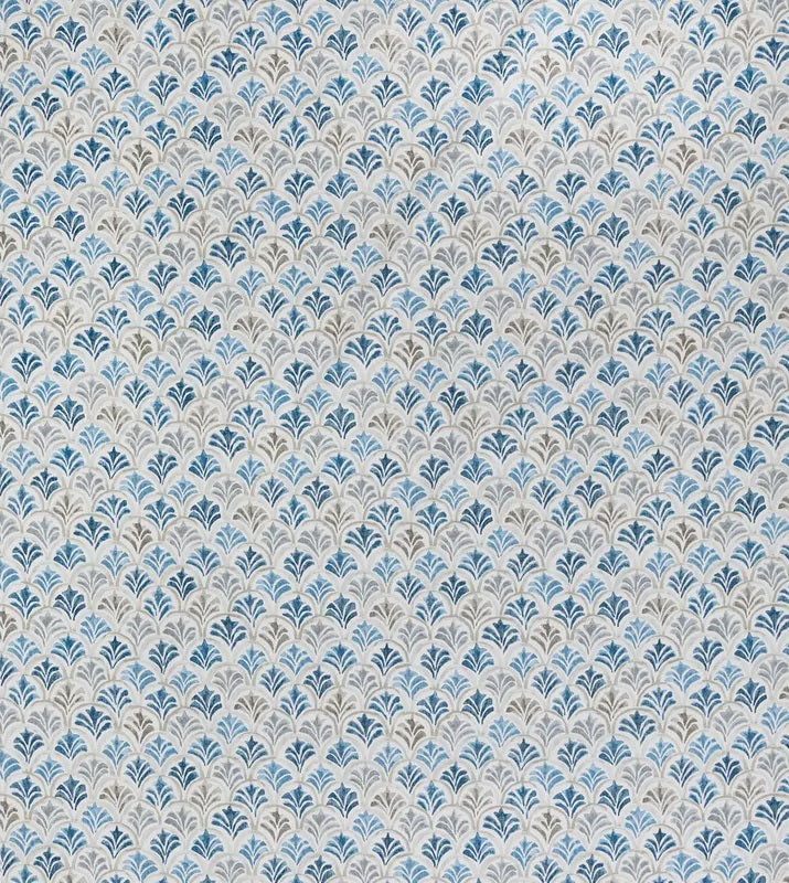 DESCRIPTION: Magnolia Home Countess Fabric in Delft features a scallop design created with a watercolor technique. Colors featured shades of blue, beige and grey on a cream colored background. Elevate your home decor with the exquisite Magnolia Home Fashions Fabrics.