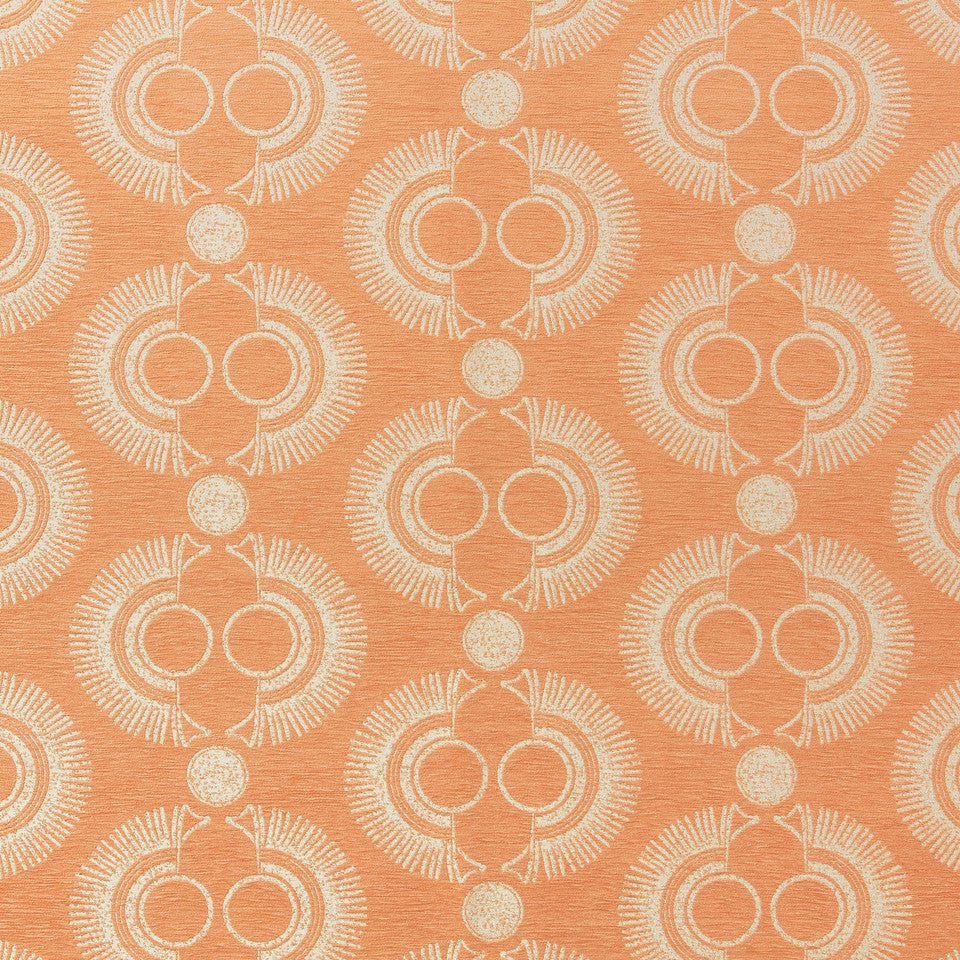 DESCRIPTION: P/Kaufmann Sugey Chenille Fabric in Papaya central motif is a highly stylized, abstract design that is vertically symmetrical. Two prominent, concentric circles at the center with lines that flow outwards from the central circles, forming a larger, almost mask-like shape. There are numerous short, radiating lines extending from the curved edges, creating a sunburst or fringe effect. The highly stylized, abstract design is in gold on a papaya (peachy) chenille fabric.