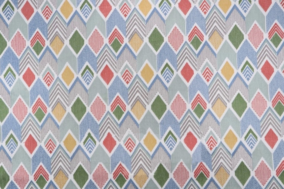 DESCRIPTION: P/Kaufmann Happy Vibes Embroidered Fabric in Carnival features a vibrant, colorful geometric composition with Amerindian inspiration, showcasing a dynamic interplay of shapes like diamonds and chevron-like patterns. The embroidery creates a sense of movement and energy through carefully considered tones, contrasts, and highlights. The color palette features the colors of white, gray, yellow, mint, green and salmon.
