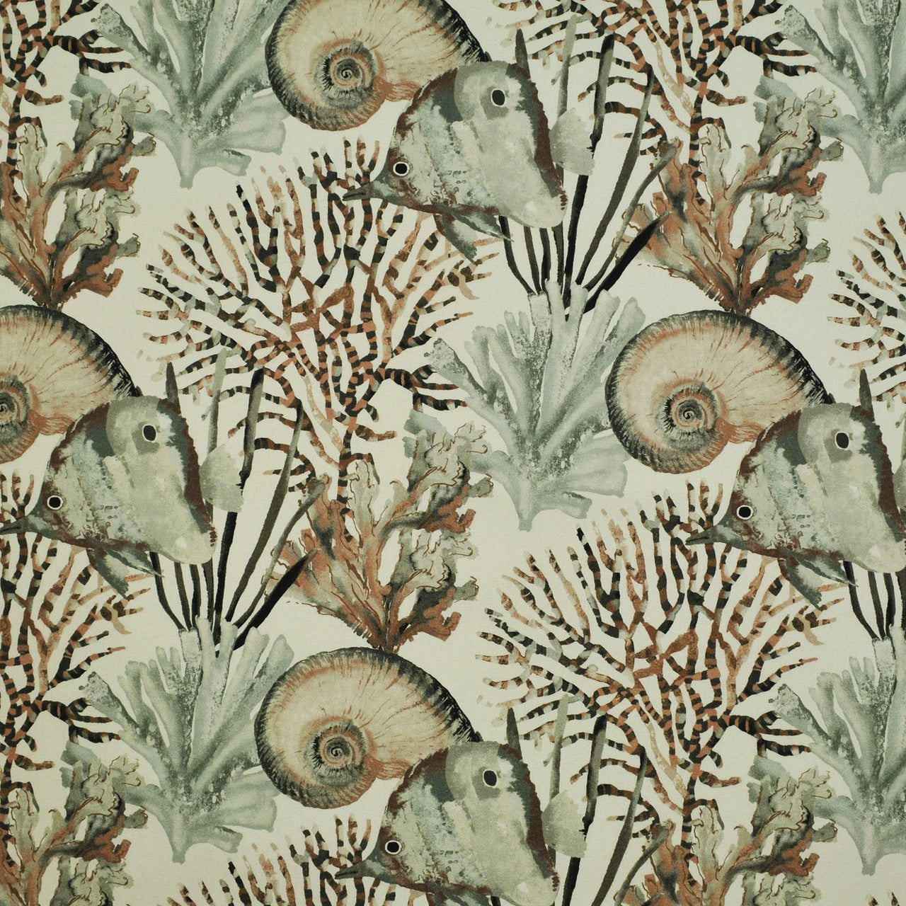 DESCRIPTION: P/Kaufmann St. Tropez Fabric in Dune is from the Marina Bay Collection. The design prominently showcases seashells, conch shells, fish, and various types of coral and sea fan structures. The colors are earthy and muted, including shades of brown, beige, and a soft, desaturated green or blue-grey, evoking a natural, weathered aesthetic.