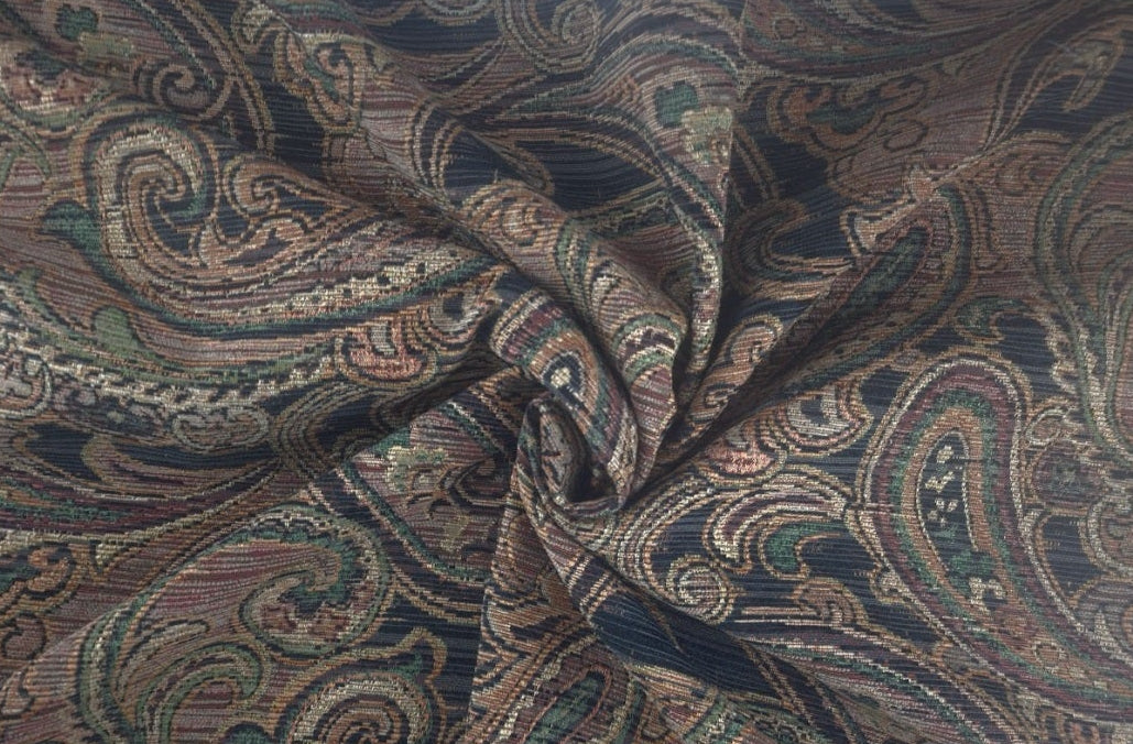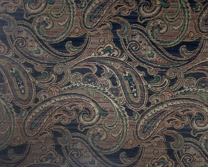 DESCRIPTION: Paisley Chenille Woven Fabric in Charcoal is a jacquard fabric that features a repeating paisley design. The fabric has a woven, chenille texture, which gives it a soft, slightly raised surface. The primary colors are the black background with paisley motifs in shades of brown, rust, gold, and olive green.