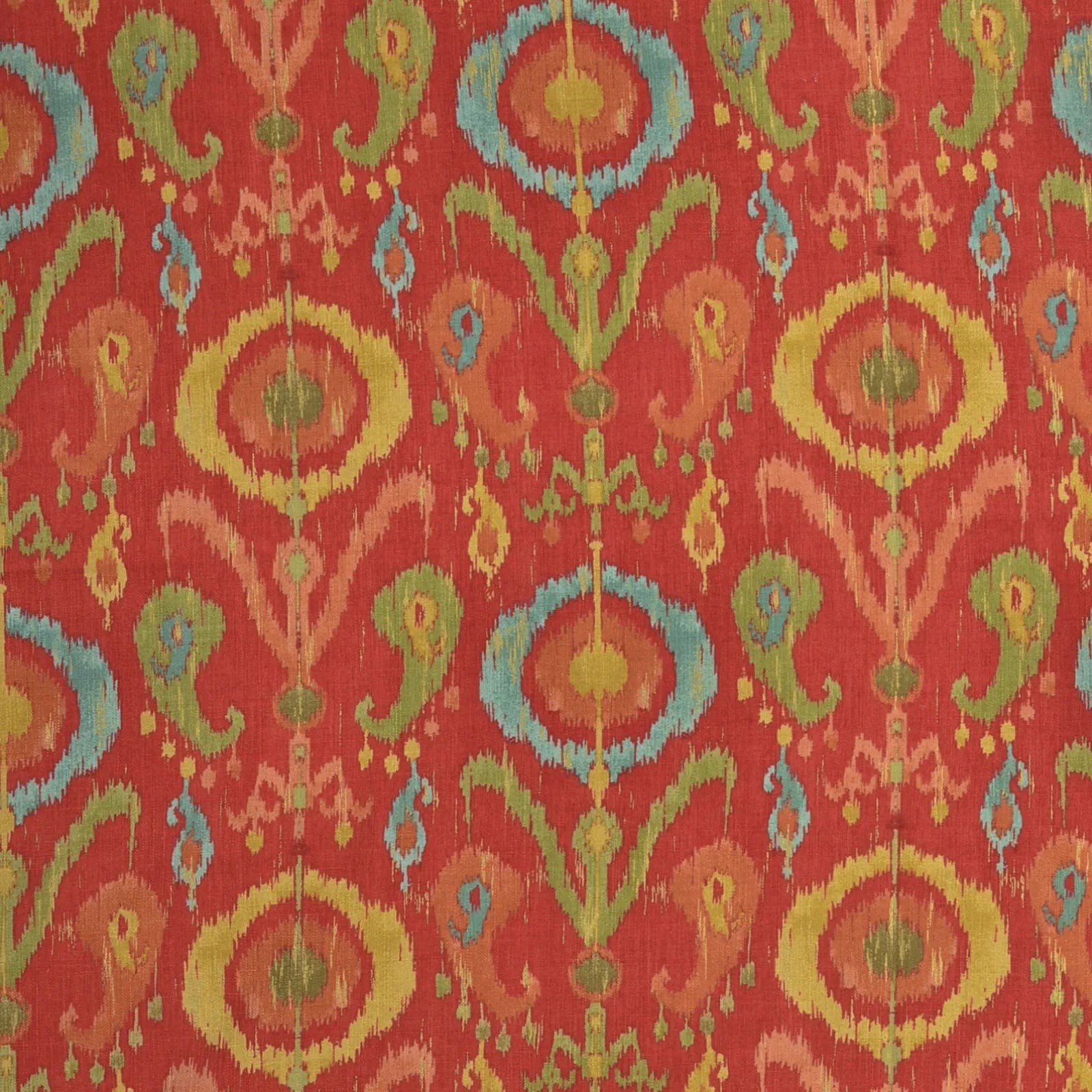 DESCRIPTION: Richloom Platinum Collection Ethnic Ikat is a premium quality linen/rayon fabric that features a vibrant ikat design. The color registration shows yellow, lime green, teal and orange on a pomegranate red-colored background.