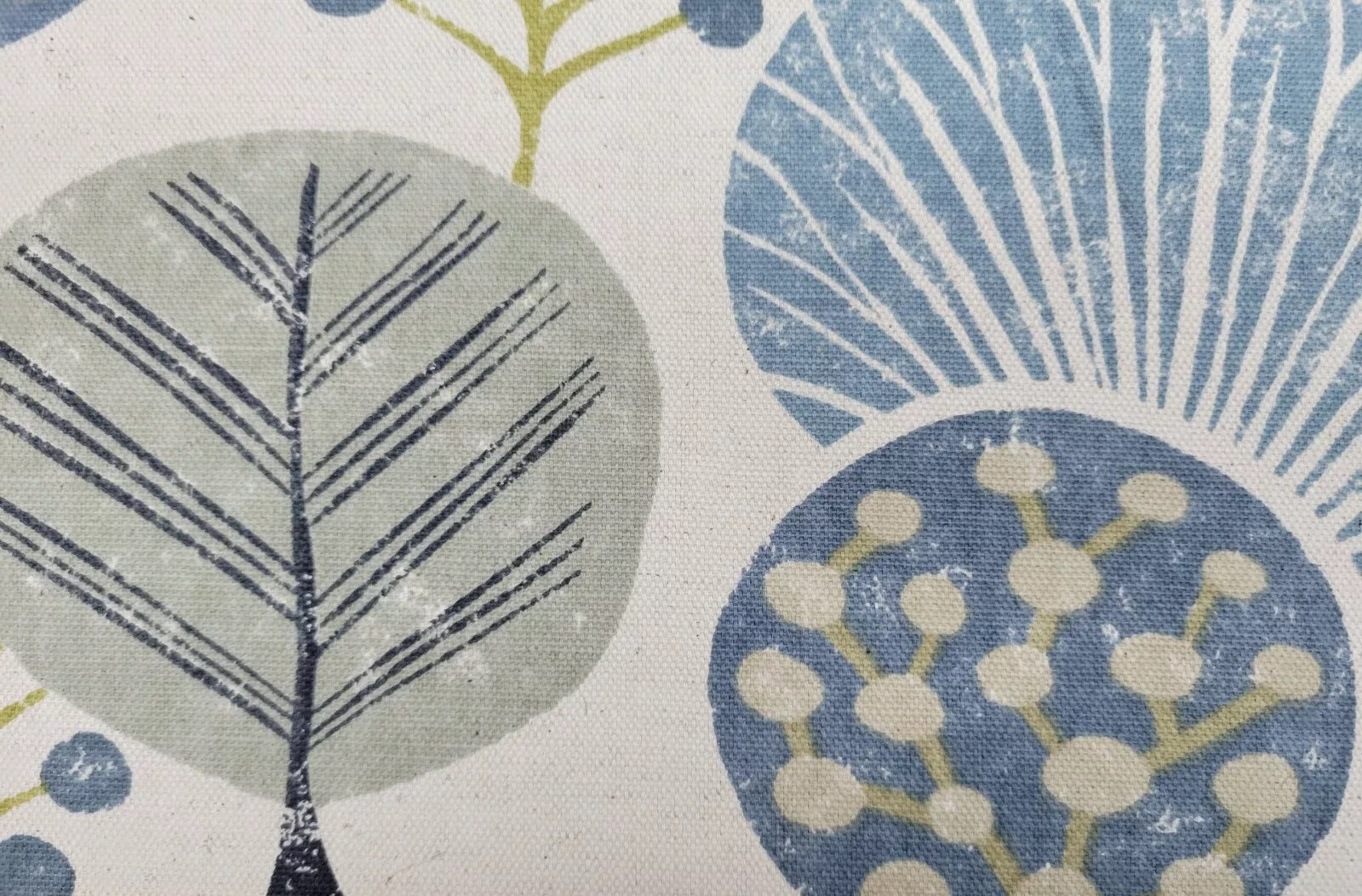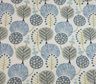 DESCRIPTION: Bring a little uniqueness to your home decor with Richloom's Pyper Fabric in Slate. The fabric features a multi-tree design on a cotton, linen blend fabric. The color registration shows dark blue, light blue, grey, citron green, beige and black on a dark cream background.