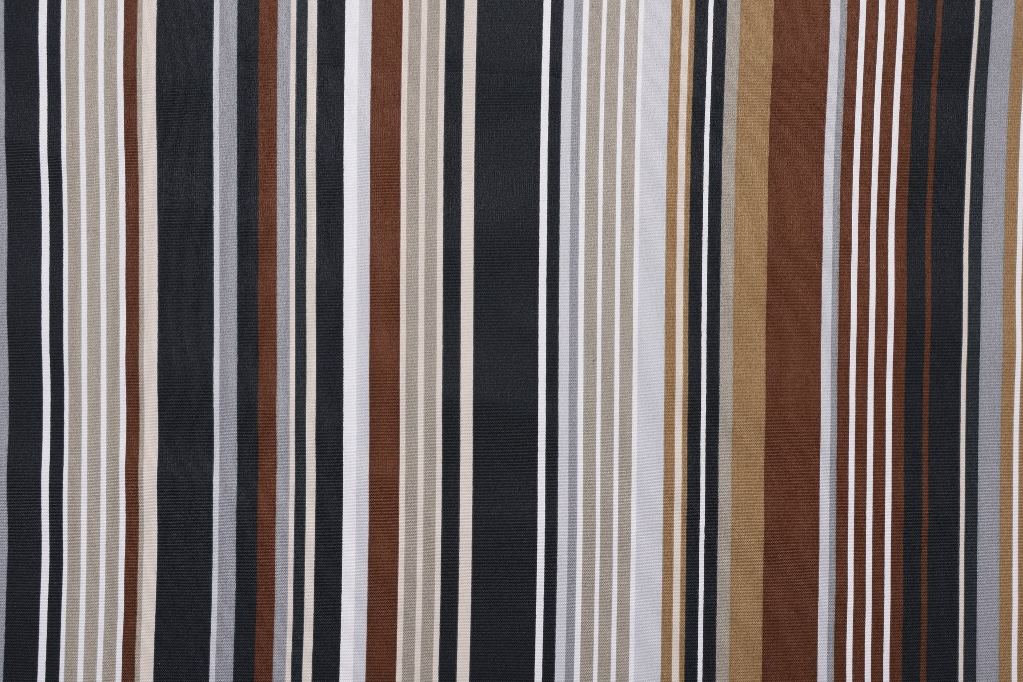 DESCRIPTION: Richloom Solarium Labrisa Outdoor Fabric in Rattan features a striped pattern with multiple widths and colors, including shades of black, brown, gray, beige, and white. Able to resist stains and water, the fabric is also breathable and designed to withstand UV direct sunlight for 500 hours.