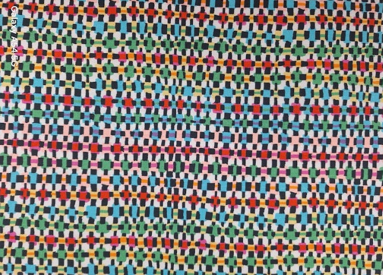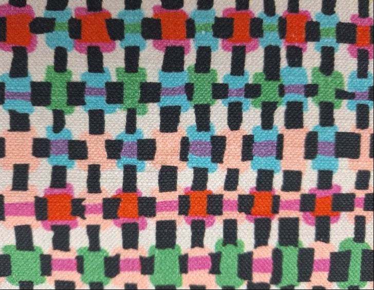 DESCRIPTION: Richloom Suri Fabric in Tropic features a repeating grid pattern featuring abstract, stylized cross-like shapes in various colors, alternating with solid black squares. The color palette is vibrant, including shades of turquoise, pink, orange, and green against a light, ivory background.