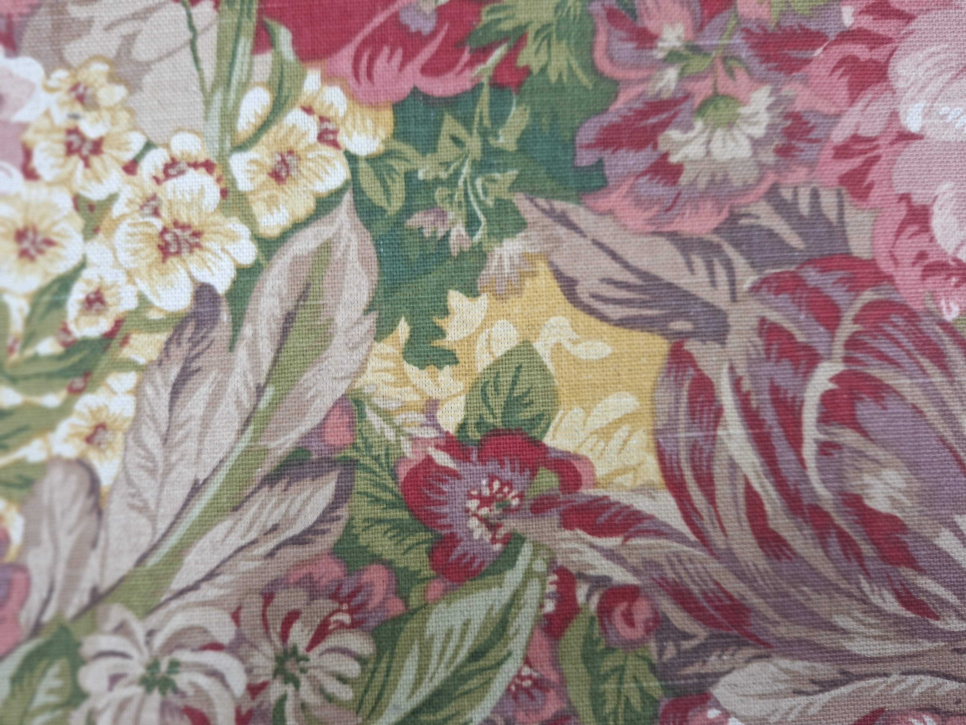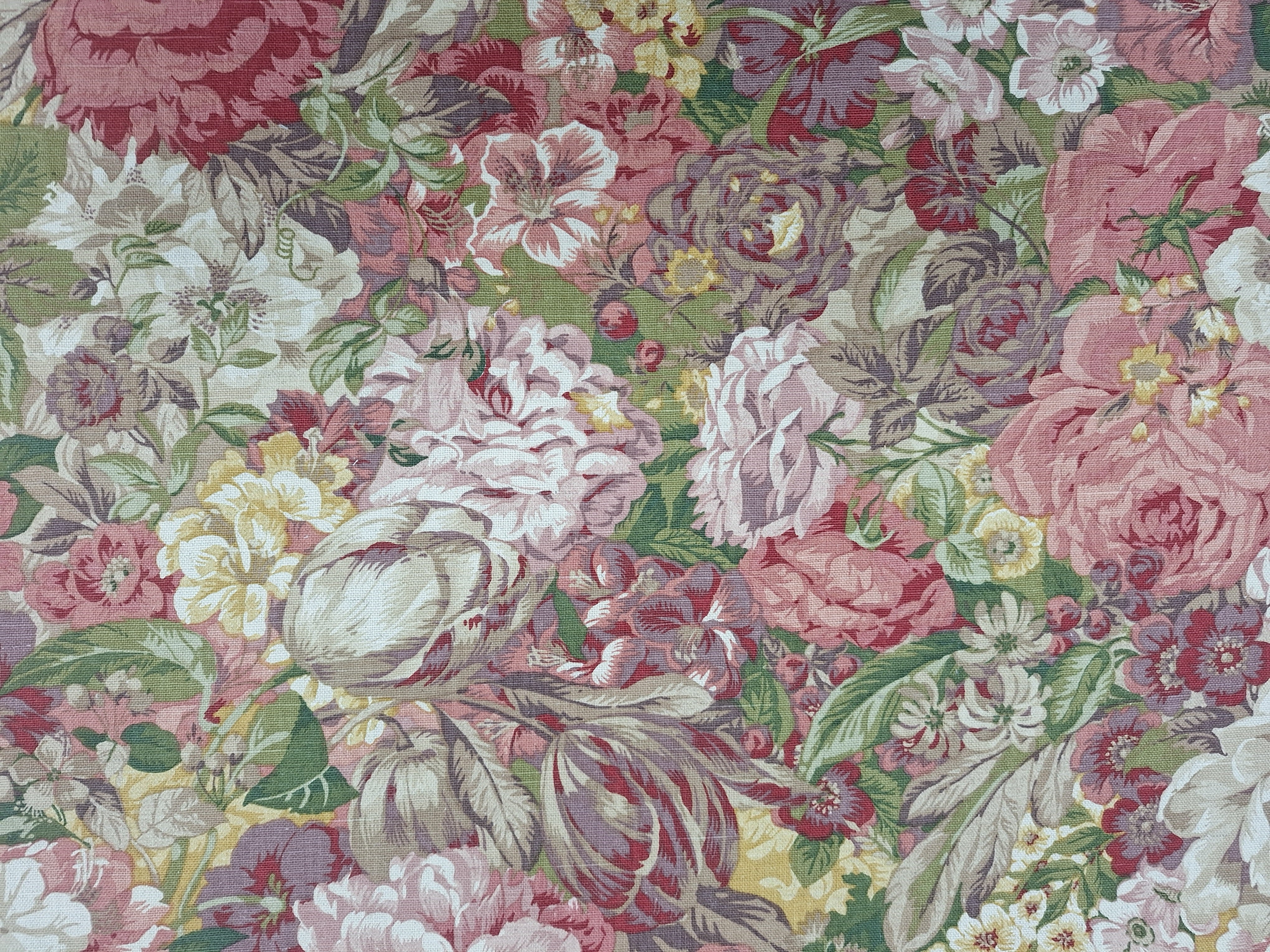 DESCRIPTION: Olivia's Garden Floral Fabric is a traditional floral fabric featuring roses, tulip and other flora It's a versatile fabric suitable for various projects. The color registration shows red, rose, green, yellow, purple, lavender, khaki, cream and white.