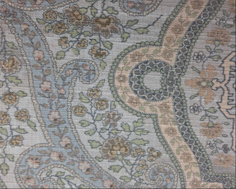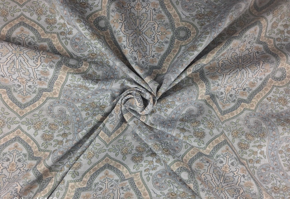 DESCRIPTION: Swavelle Mill Creek Avalon Fabric in Winter Sky features an intricate and symmetrical, centered around a stylized medallion/floral motif. This central element is surrounded by large, curved, teardrop-shaped figures, similar to a paisley design. The overall composition suggests a traditional and aesthetic design reminiscent of a tapestry. tablecloth. The color palette is muted and earthy consisting of light blue, beige, brown, and various shades of green. These colors are set against a light blue/gray background on a linen weave fabric