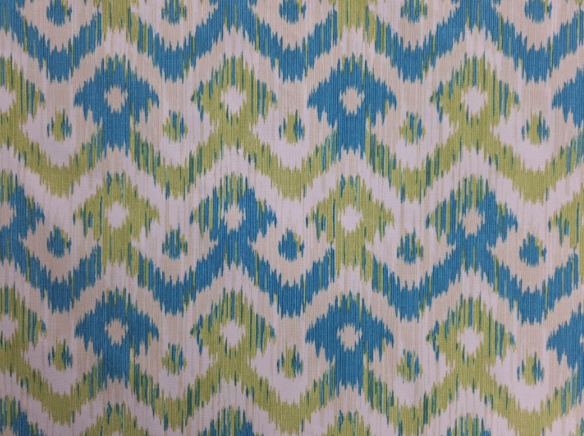 DESCRIPTION: Swavelle Mill Creek Nixie Outdoor Fabric in Lagoon features a Ikat design with  apparent "blurriness" or feathered look of the design.  The colors are blue, and lime green on a off-white background.