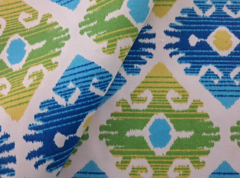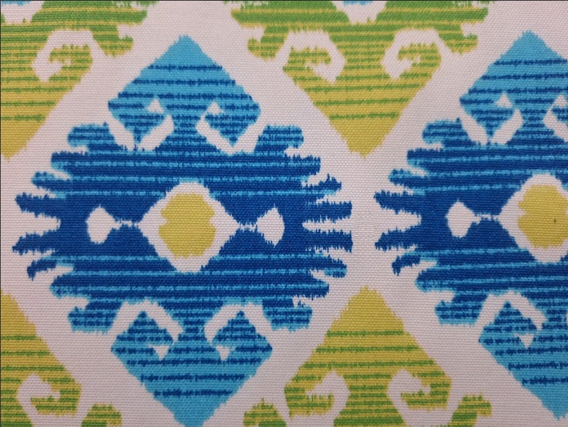 DESCRIPTION: Swavelle Mill Creek Tropix Outdoor Fabric in Lagoon features a geometric pattern of interconnected diamond and medallion shapes. It utilizes the characteristic blurriness of traditional ikat design, where the yarns are resist-dyed before weaving, creating an intricate and complex design. The design incorporates a bright and bold color palette, including shades of blue, green, yellow and turquoise blue on a white background.