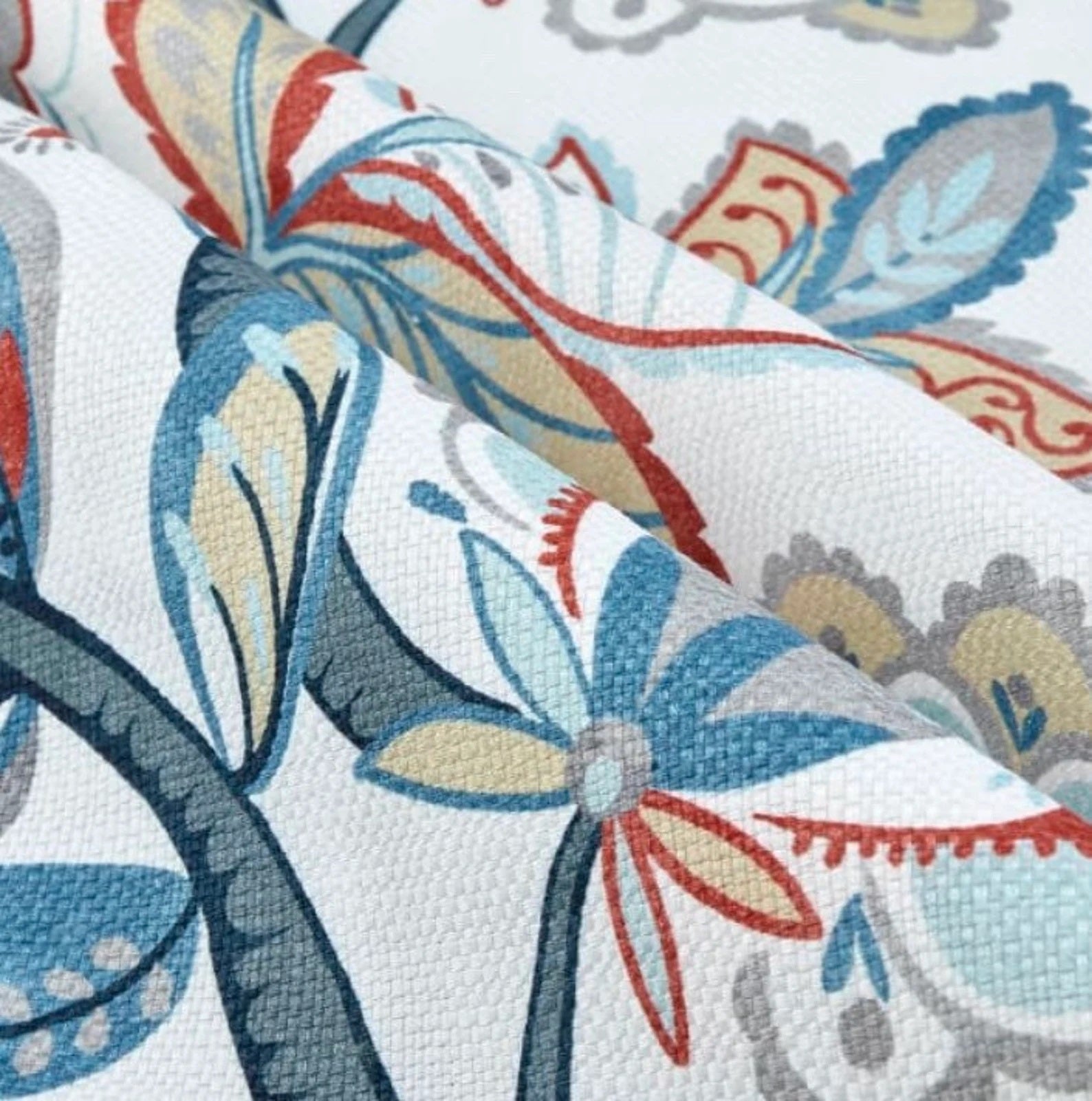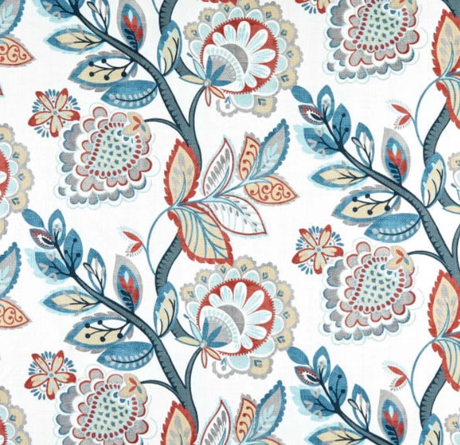 DESCRIPTION: Swavelle Wynette Madden Basket Weave Fabric in Mixed Berry is a stylized floral and leaf motifs interconnected by winding, dark-colored branches and elaborate flowers featuring multiple layers of petals in various shapes and sizes. Colors featured are reddish-orange, teal blue, taupe, and coral rose on a ivory colored background.