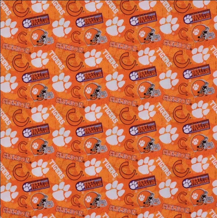 DESCRIPTION: This fabric is an officially licensed, 100% cotton print featuring the logos and colors of the Clemson Tigers. The design has an allover, repeating pattern on a crimson red background. The motifs celebrate the university and include various emblems and phrases. The primary colors are the team's official colors of orange, purple and white with black are also used.
