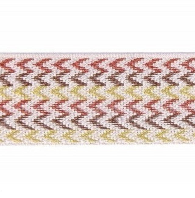 DESCRIPTION: Europatex ~HT-1692 ~ Color: Dessert Trim features a repeating zigzag or chevron-like geometric design. The pattern is composed of several horizontal rows of small, pointed shapes. The colors include shades of reddish-brown, dark brown, and yellowish-green, woven on a light beige or off-white background. Adding trim greatly enhances the look and offers a new level of elegance to your projects.