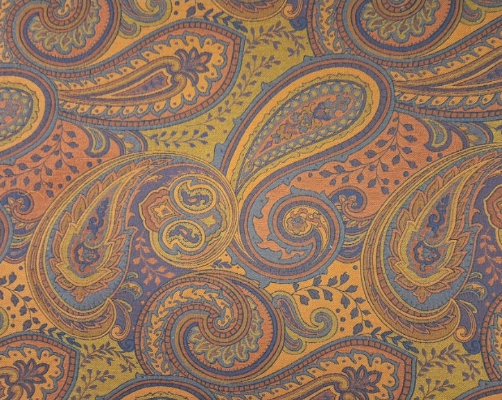 DESCRIPTION: Purveyor Jewel Jacquard Fabric M9196 by Barrow Designer Fabric features a detailed paisley pattern, which includes ornate curls and flourishes. The primary colors are various shades of orange with accents of blue, navy and gold.