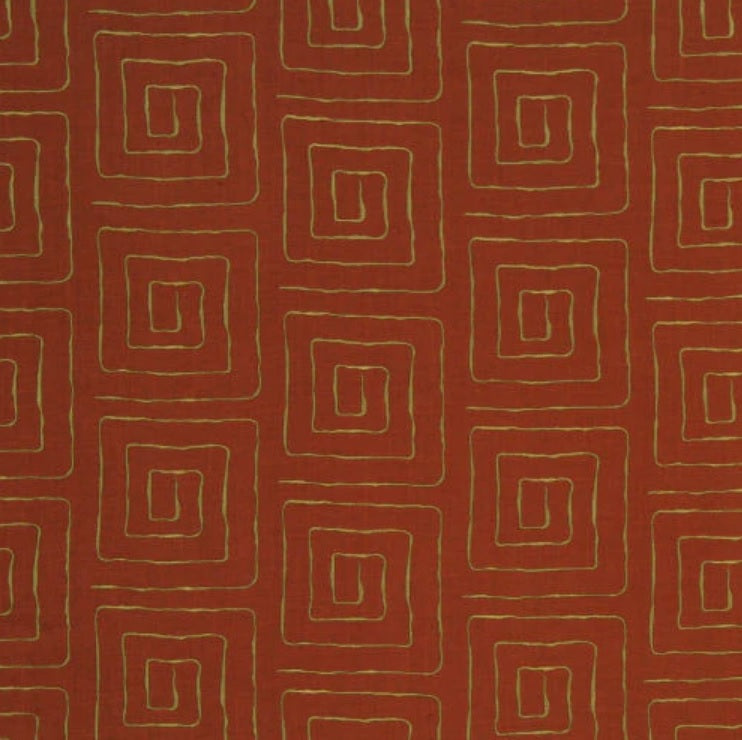 DESCRIPTION: From the Festival of Colors Collection, Amazing Race is an embroidered square maze design in gold on a tomato (dark orange) colored fabric.