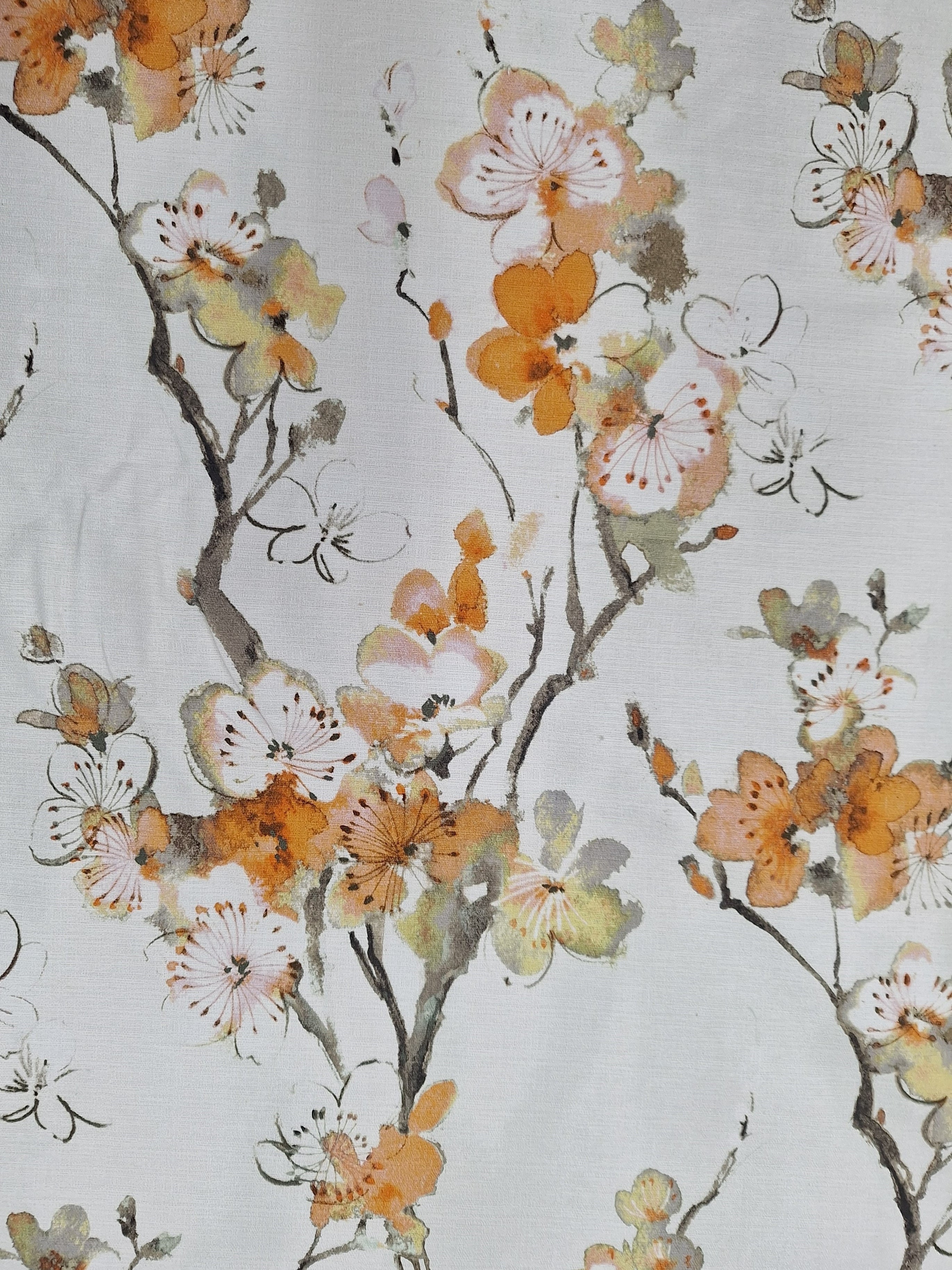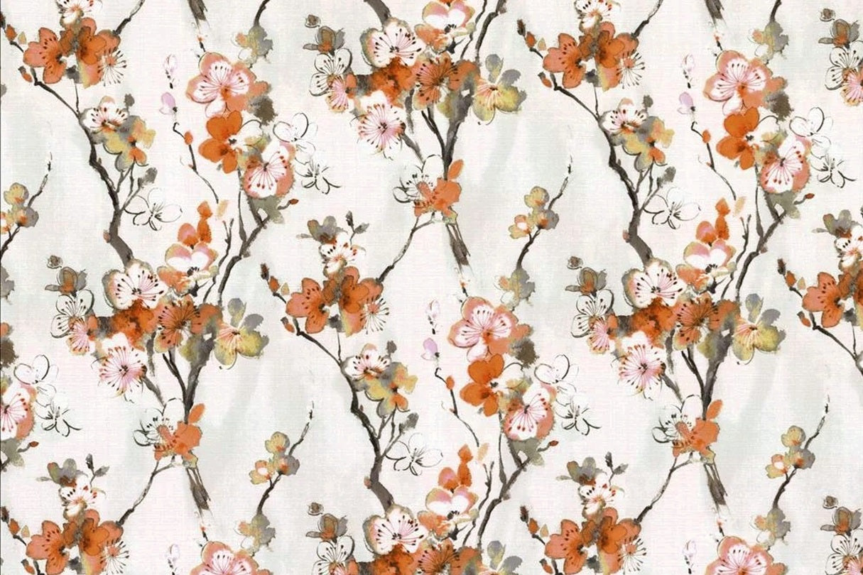 DESCRIPTION: Swavelle Mill Creek Swavelle Mill Creek Sissinghurst Fabric in Orange Blossom features a watercolor-style depiction of Asian blossom trees, with branches and flowers. It is reminiscent of Japanese Sakura tree. The blossoms are primarily in shades of orange, light yellow, and soft white, with branches in brown and charcoal grey.