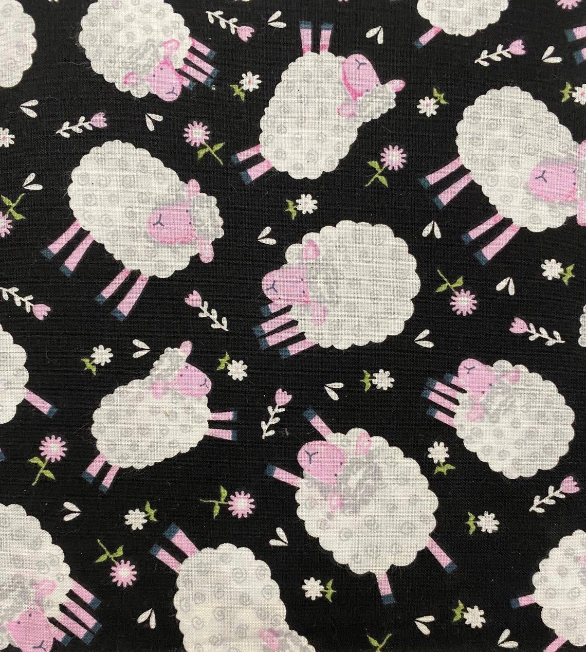 DESCRIPTION: Santee Fabrics Sheep and Flowers Quilting Fabric in Black features tossed white sheep with pink faces and legs. The primary colors are black for the background, white for the sheep's bodies, and pink for their faces, legs, and the small scattered flowers.