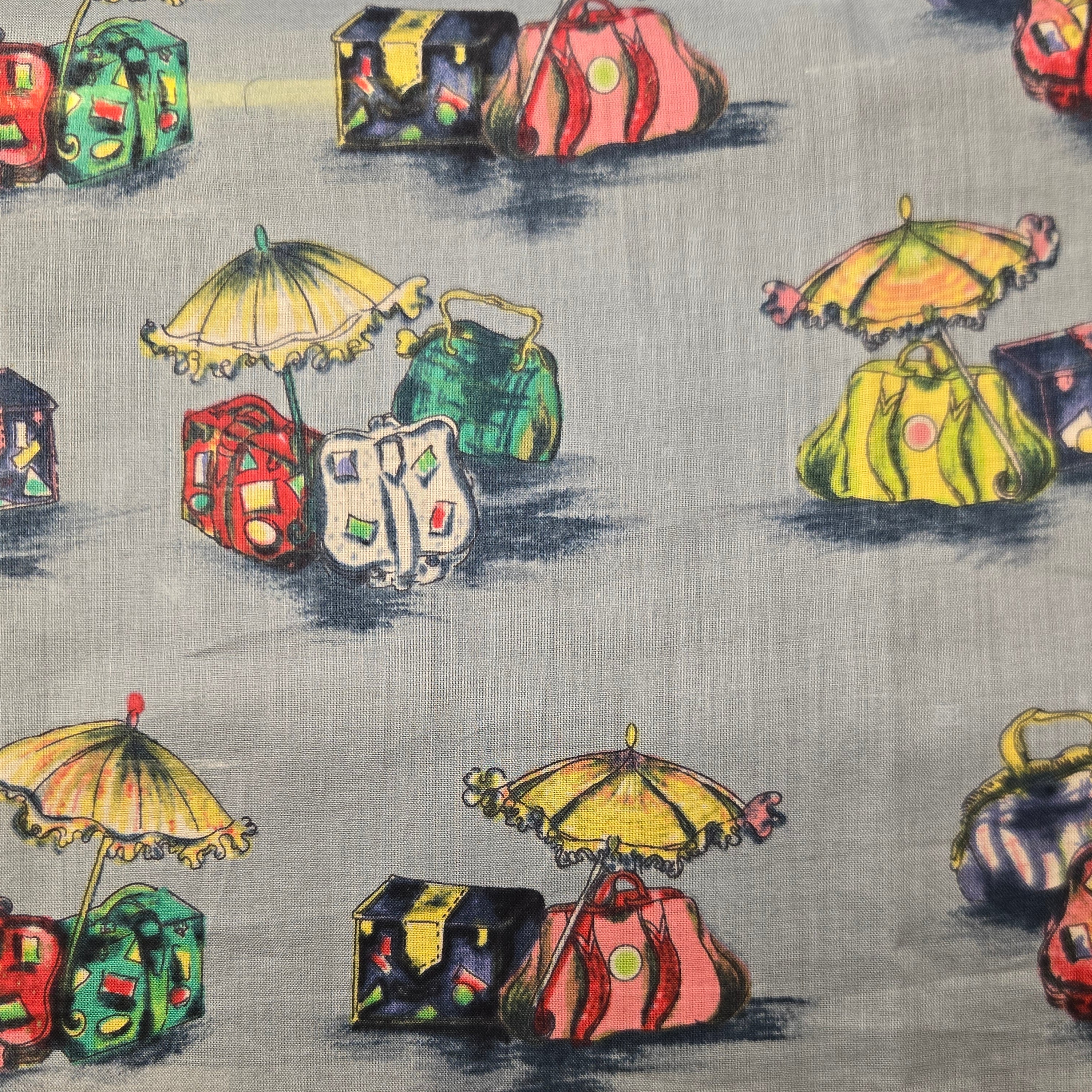 DESCRIPTION: Ascher Studio Fabric Luggage Quilting Fabric in Blue features open umbrellas and various styles of bags and suitcases. The color palette shows red, green, yellow, purple, pink, and black on a blue background.