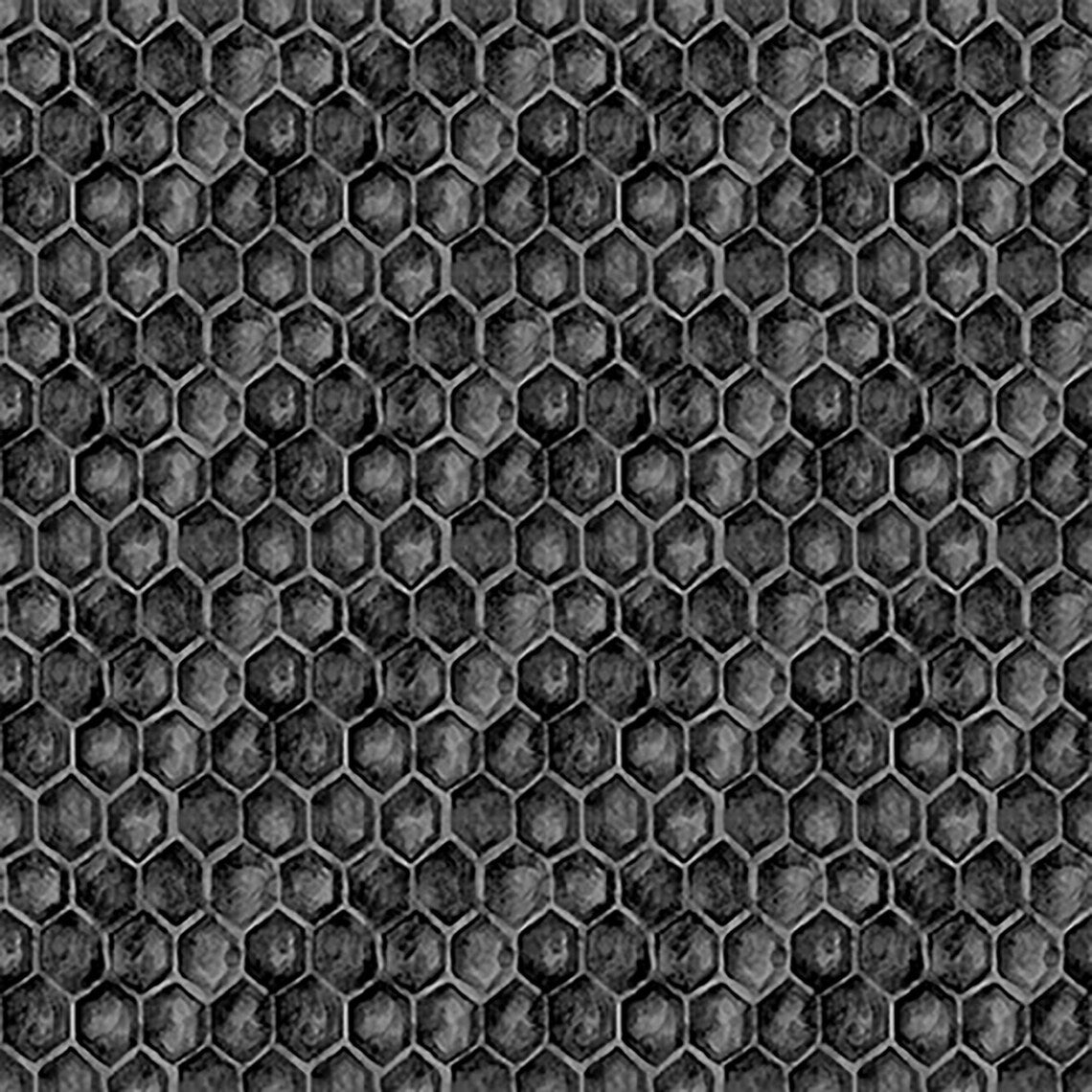 DESCRIPTION: Blank Quilting Fabrics Blank Quilting Fabrics by Janice Gaynor features a repeating hexagonal honeycomb pattern. The primary color is charcoal, with variations in shade creating depth and texture within the honeycomb cells.