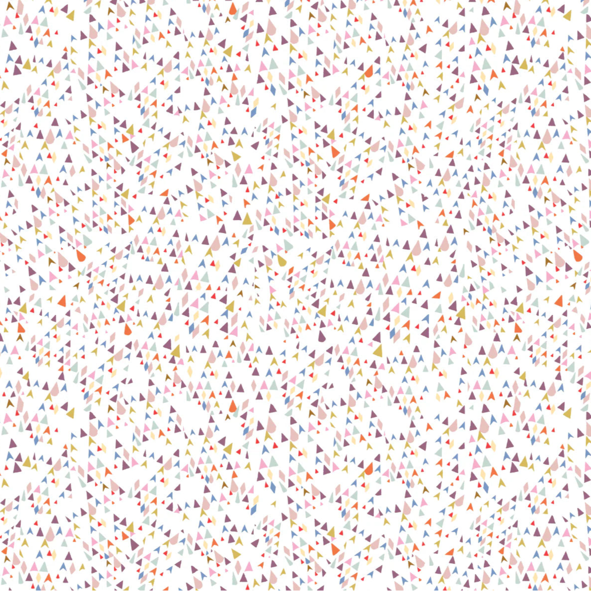 DESCRIPTION: Free Spirit Fabrics Night Fancy Drift Quilting Fabric in White by Victoria Findlay Wolfe features a dense, seamless repeat pattern of numerous small, irregularly shaped triangles scattered across a clean white background, resembling a terrazzo or confetti-like design.