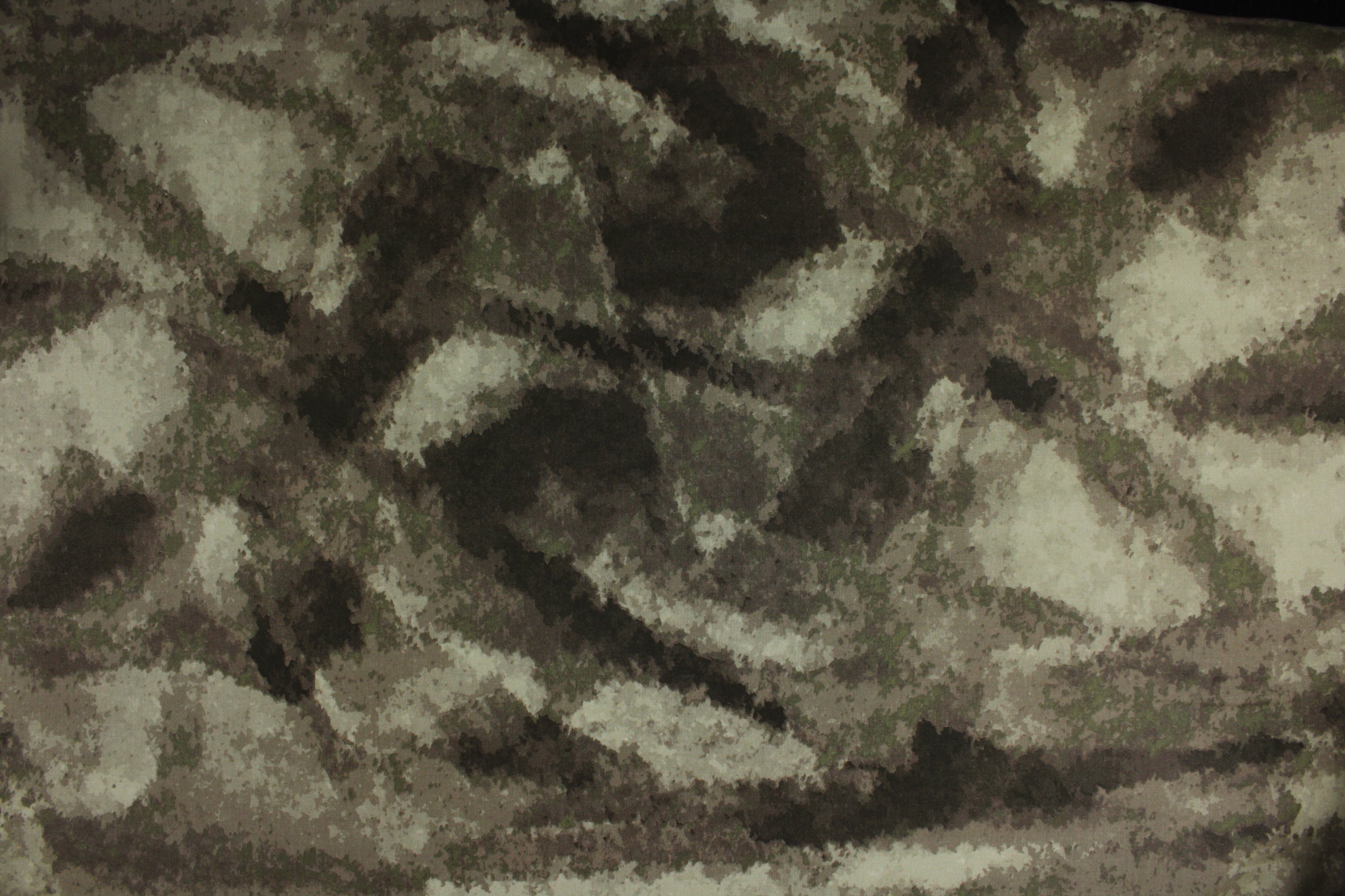 DESCRIPTION: A camouflage print in earth tones, specifically shades of green charcoal, and brown. It is a light weight, soft, 100% Cotton Twill.