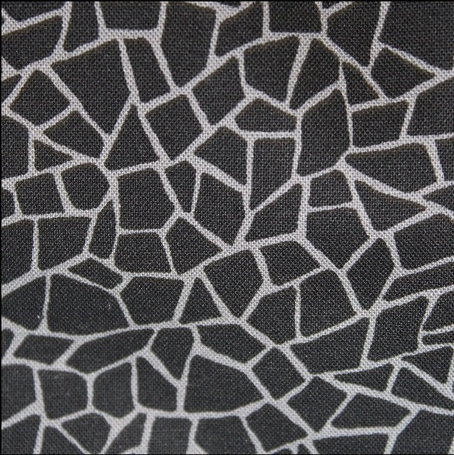 DESCRIPTION: Stof Fabrics Crackled Glass Quilting Fabric features a mosaic or cracked pattern with a black background and gray lines outlining irregular, polygonal shapes.