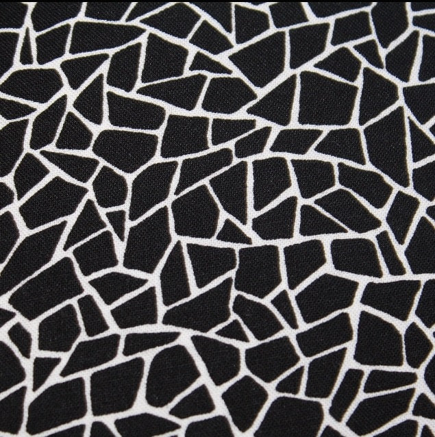 DESCRIPTION: Stof Fabrics Crackled Glass quilting Fabric features a mosaic or cracked pattern with an black background and white lines outlining irregular, polygonal shapes.