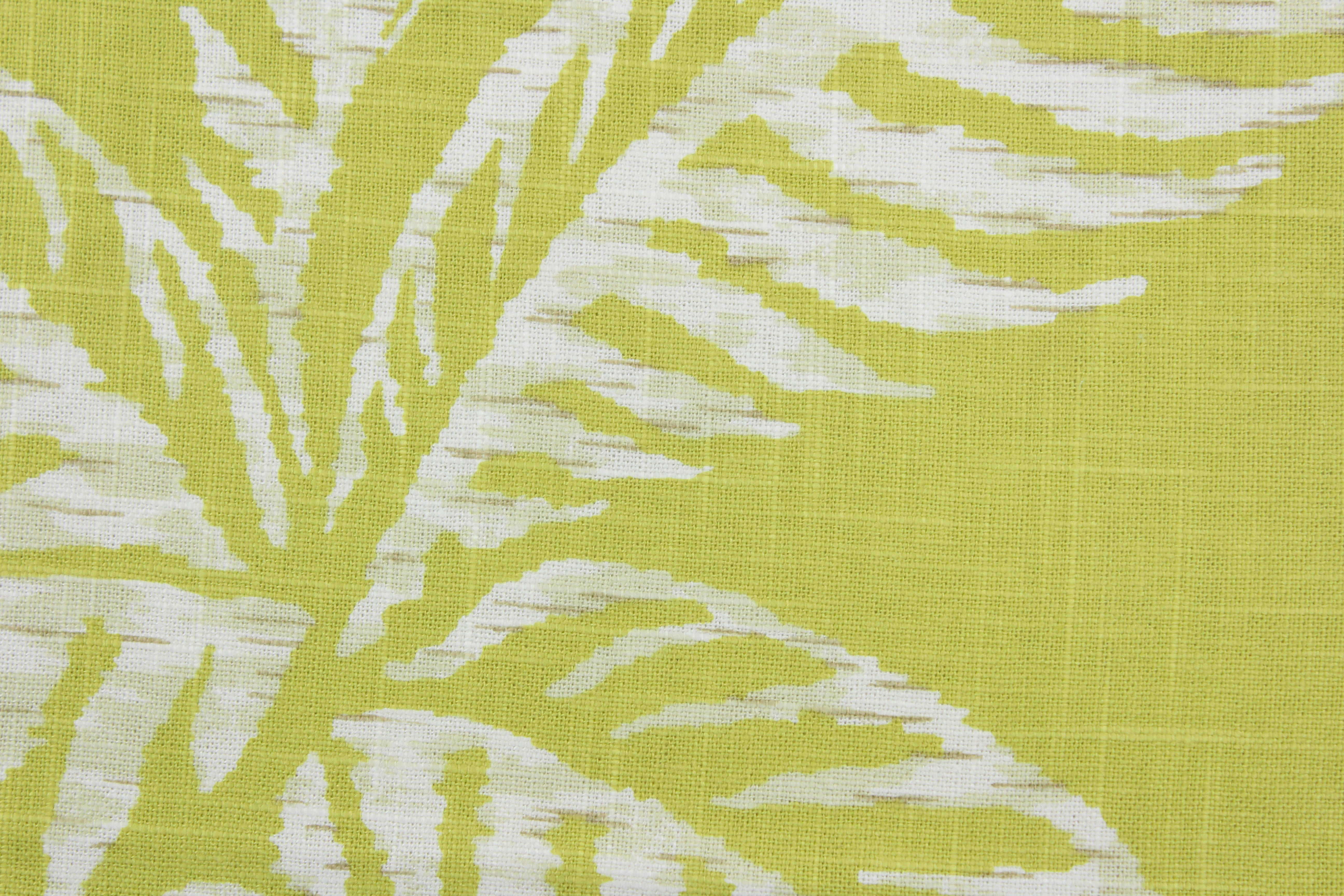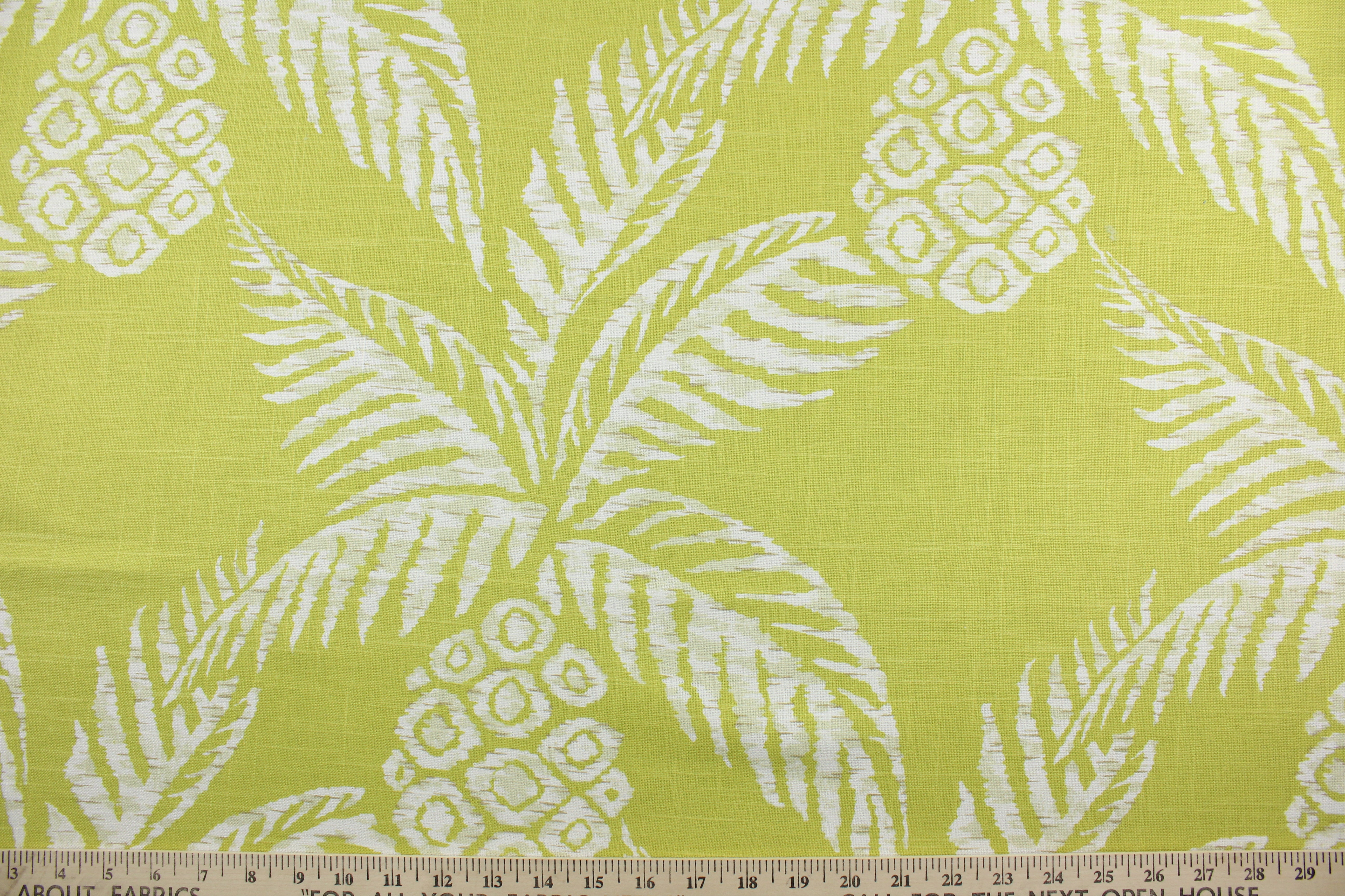 DESCRIPTION: This Robert Allen© Pina fabric is the perfect addition to any home. The multipurpose linen blend adds an elegant texture, while its distinct pattern features white pineapples against a peridot background to add a natural beauty to any room. It can be used for several different statement projects including window accents (drapery, curtains and swags), toss pillows, headboards, bed skirts, duvet covers and light upholstery.