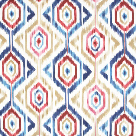 DESCRIPTION: Missed Connections Ikat Fabric in Americana is a premium quality cotton fabric that features a vibrant ikat design. The color registration shows red, blue and beige on a white colored background.