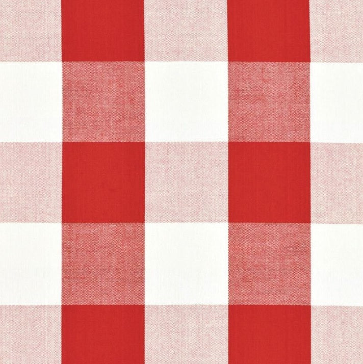 DESCRIPTION: New Check Please Red is a textured woven buffalo plaid with the look and feel of raw silk and linen. Soft and durable, perfect for curtains, bedding or upholstery. The color registration shows red and off-white.