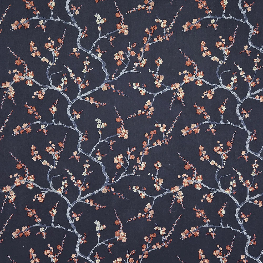 DESCRIPTION: Find The Beauty is a embroidered design similar to a cherry blossom tree. The color registration shows shades of blue, pink, rose and cream on a navy colored background.