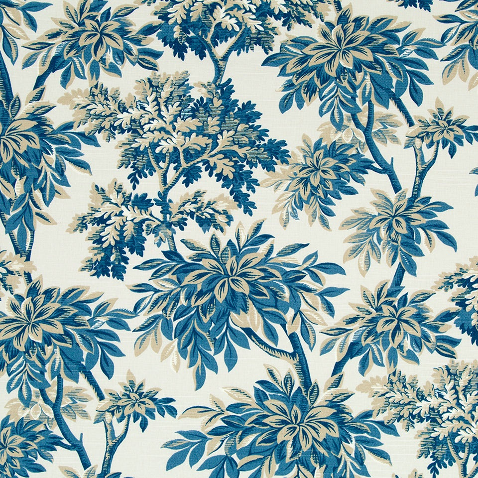 DESCRIPTION:   Robert Allen Sylvan Toile Fabric in Calypso features a botanical design of stylized trees and foliage with blue and beige accents on an ivory ground.