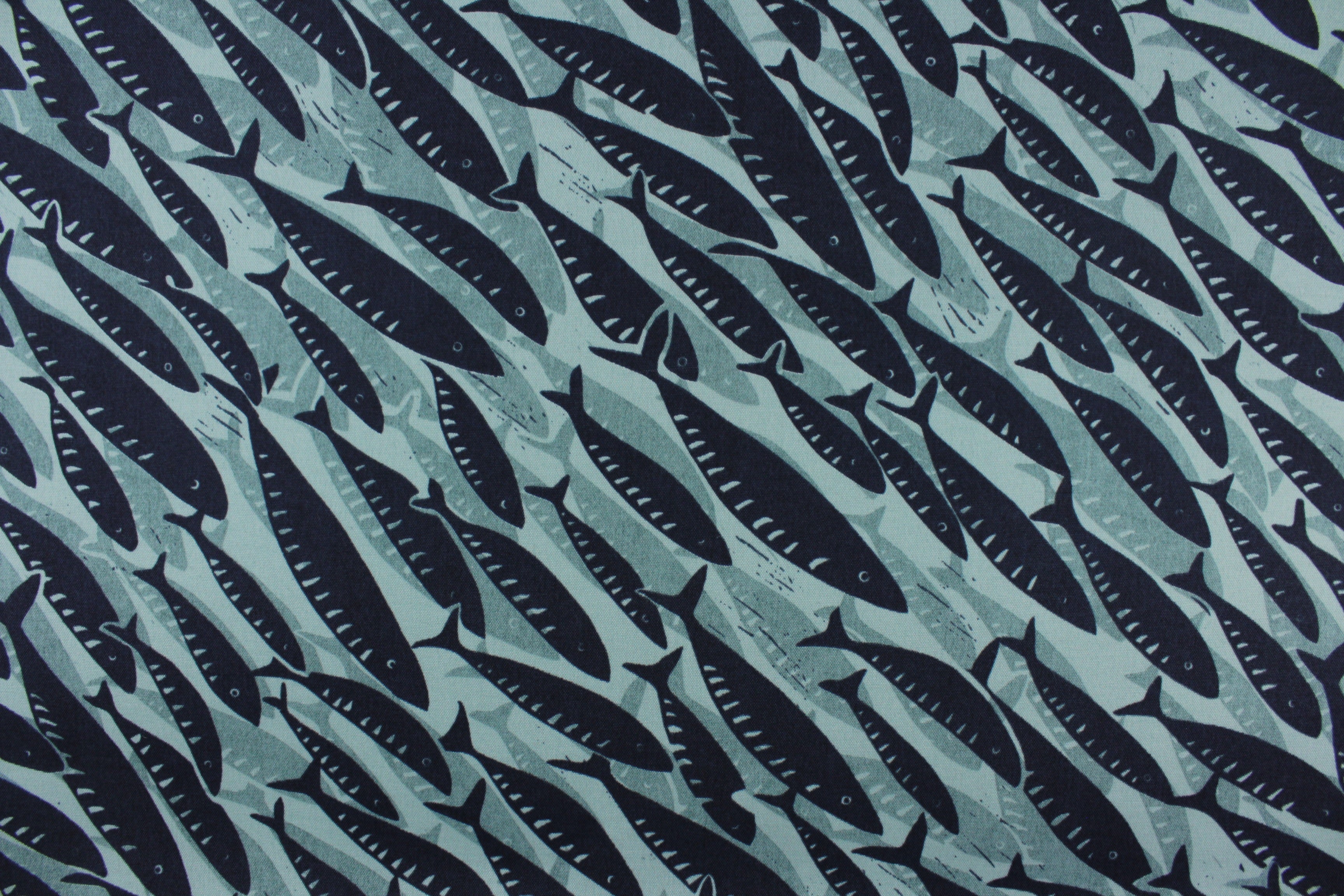 DESCRIPTION:  The ocean comes alive with school of fish.  The color registration shows two shades of navy, and two shades of aqua on a lighter shade of aqua background.   The fabric is UV and fade resistant for up to 500 hours.