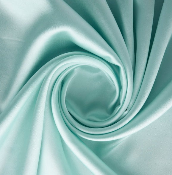 DESCRIPTION: Satin Fabric in Aqua exhibits a beautiful medium to high sheen on one side, giving it a shiny and elegant appearance. The fabric is known for its graceful drape, making it ideal for flowing garments and enhancing silhouettes. Satin can also be used in home decor for elegant and luxurious accents which provide a soft, shimmering finish to enhance a room's aesthetics.