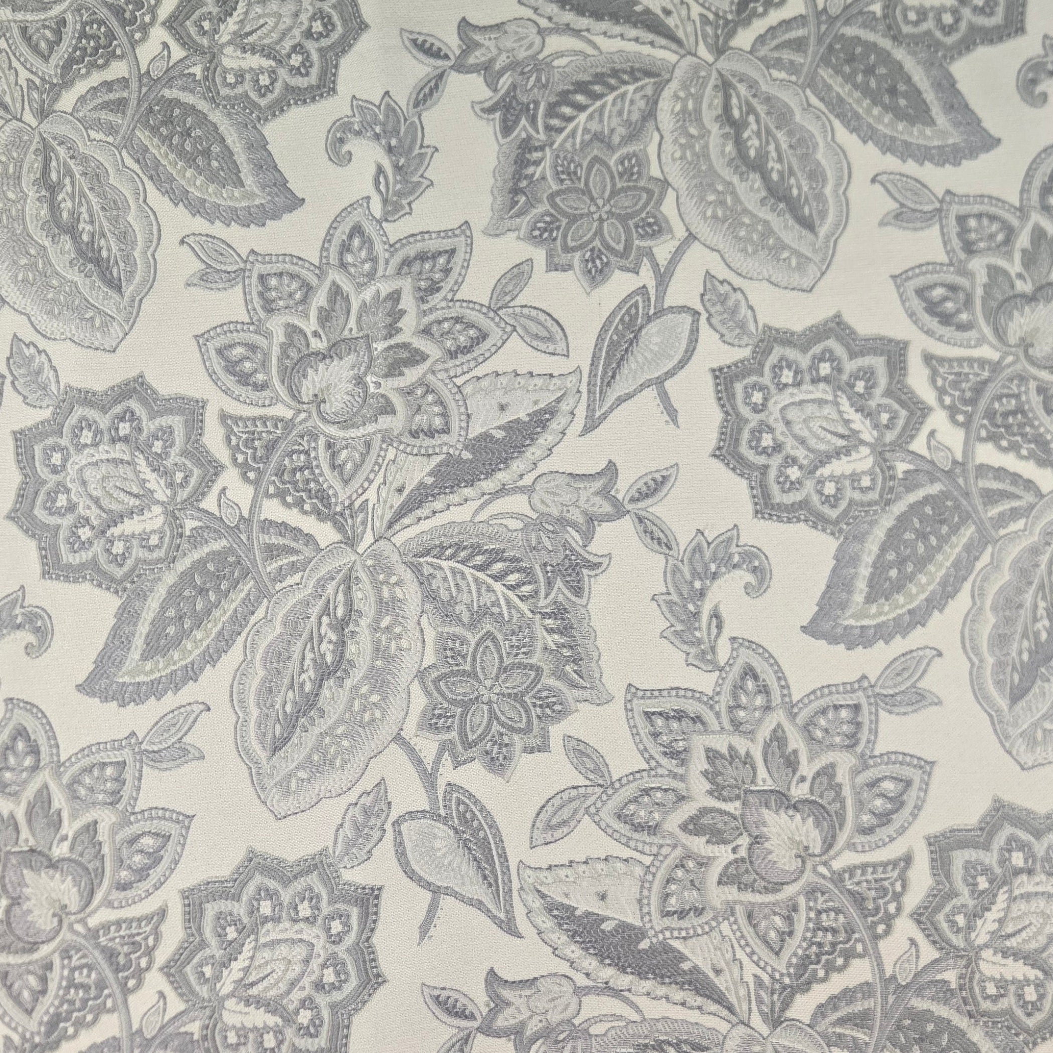 DESCRIPTION: Fleur Du Jour Jacobean Tapestry Fabric in Retreat features a large-scale Jacobean floral motif, featuring colossal blossoms and intricate leaves. The primary colors are shades of grey for the pattern elements on a cream color background fabric.