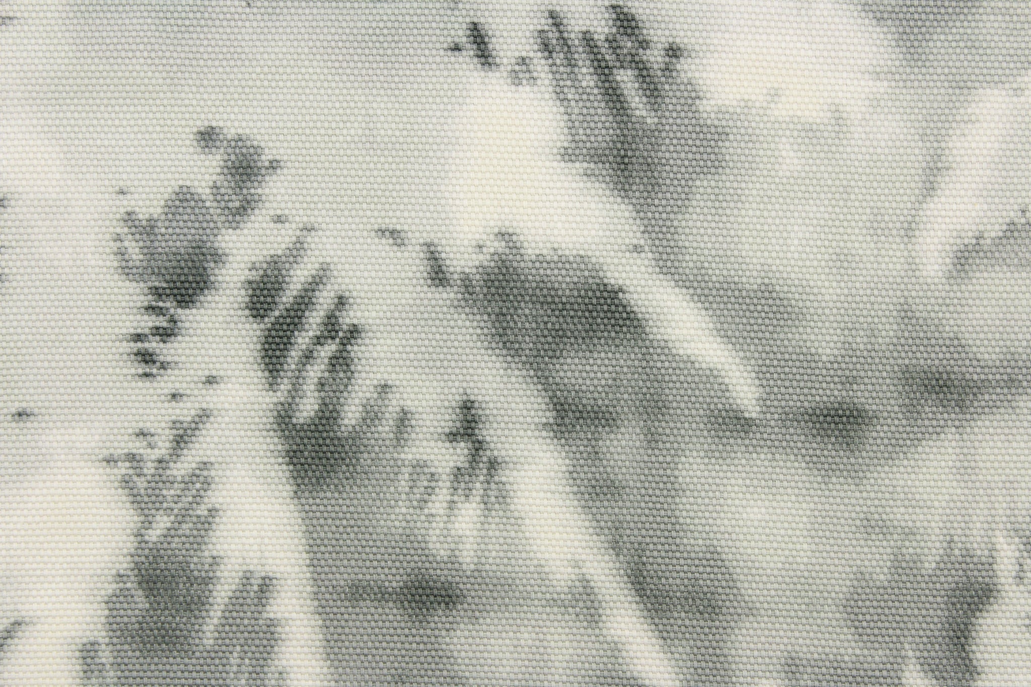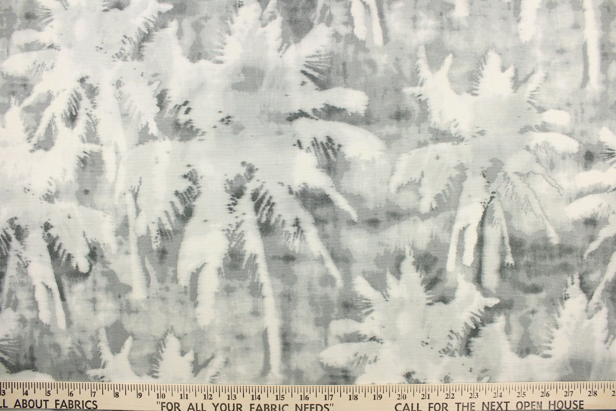 DESCRIPTION: This fabric features a silhouette palm tree design in a dull white and shades of gray. Use this for upholstery, drapery, etc. This fabric is very durable and great for upholstery projects. It has an abrasion rating of 15000 double rubs.