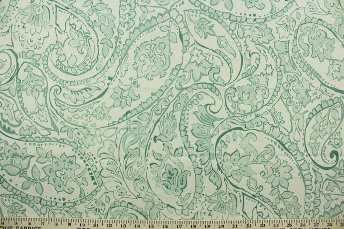 This fabric features a paisley design in  green gray tone set against a natural white .