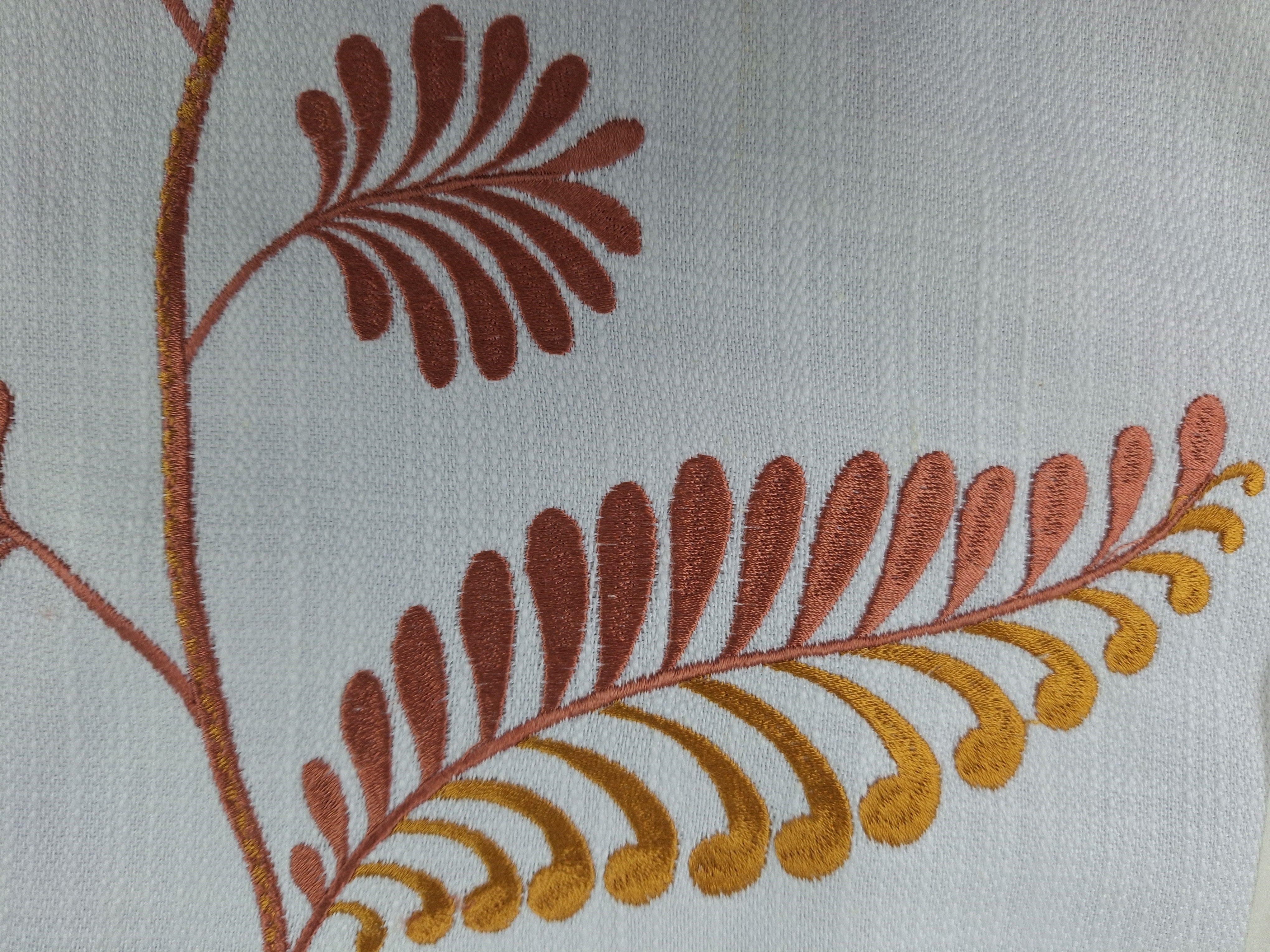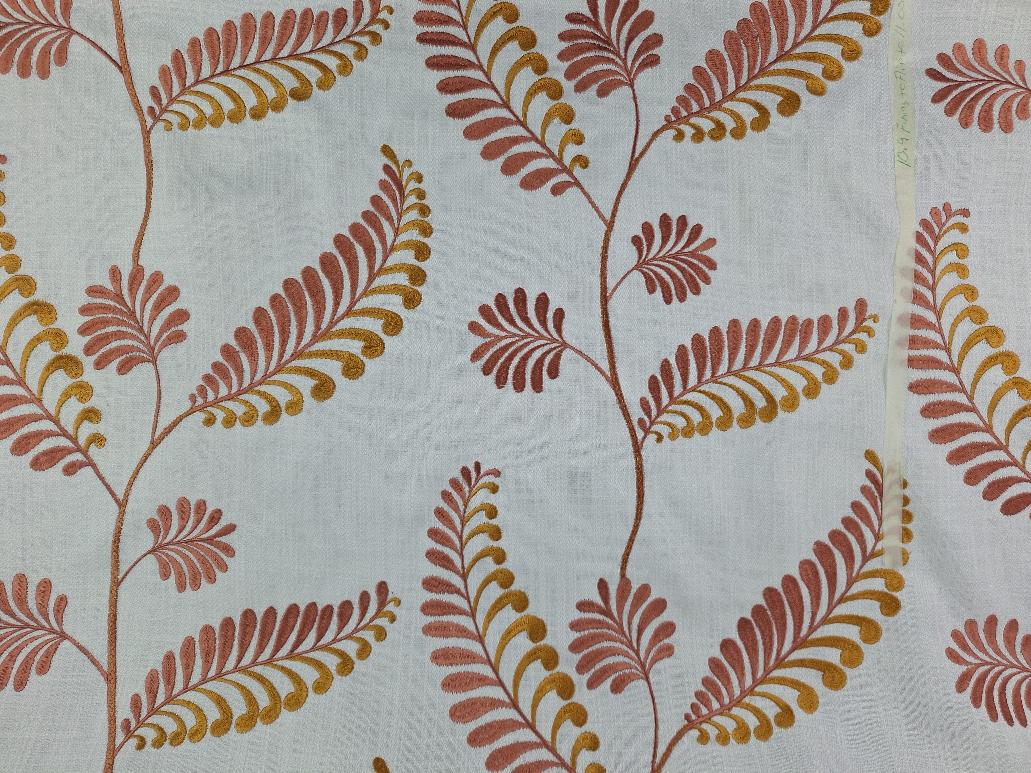 DESCRIPTION: Easy Breezy Embroidered Fabric in Sorbet features a contemporary, botanical leaf pattern in shades of salmon and gold on a white background.