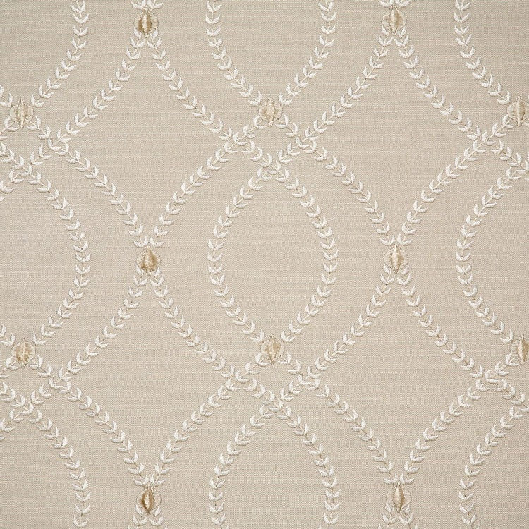 DESCRIPTION: Lumi Embroidered Fabric in Cashmere features an ivory accent geometric embroidery design on a natural colored background and a striking raised diamond embroidery design in champagne that makes an exquisite statement.