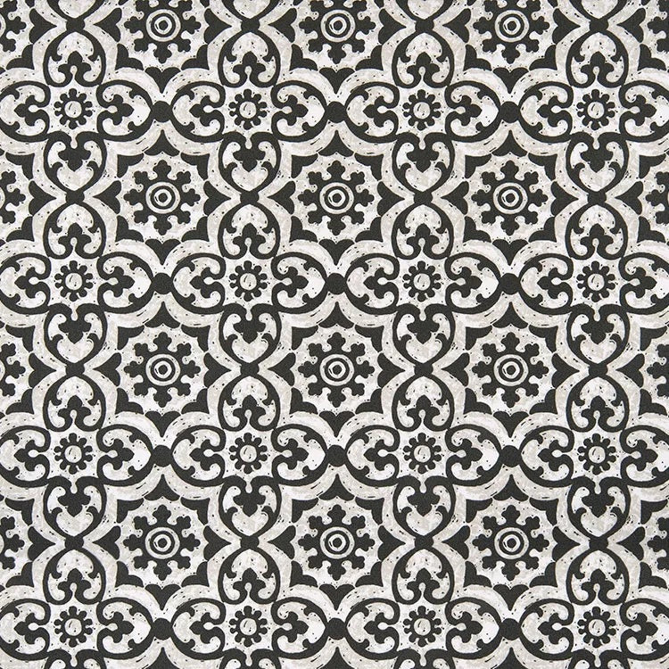 DESCRIPTION: Athens Outdoor Fabric in Black features a vintage, antique baroque-inspired intricate Moroccan tile pattern with detailed, hand-drawn line art and romantic filigree ornamental curves.