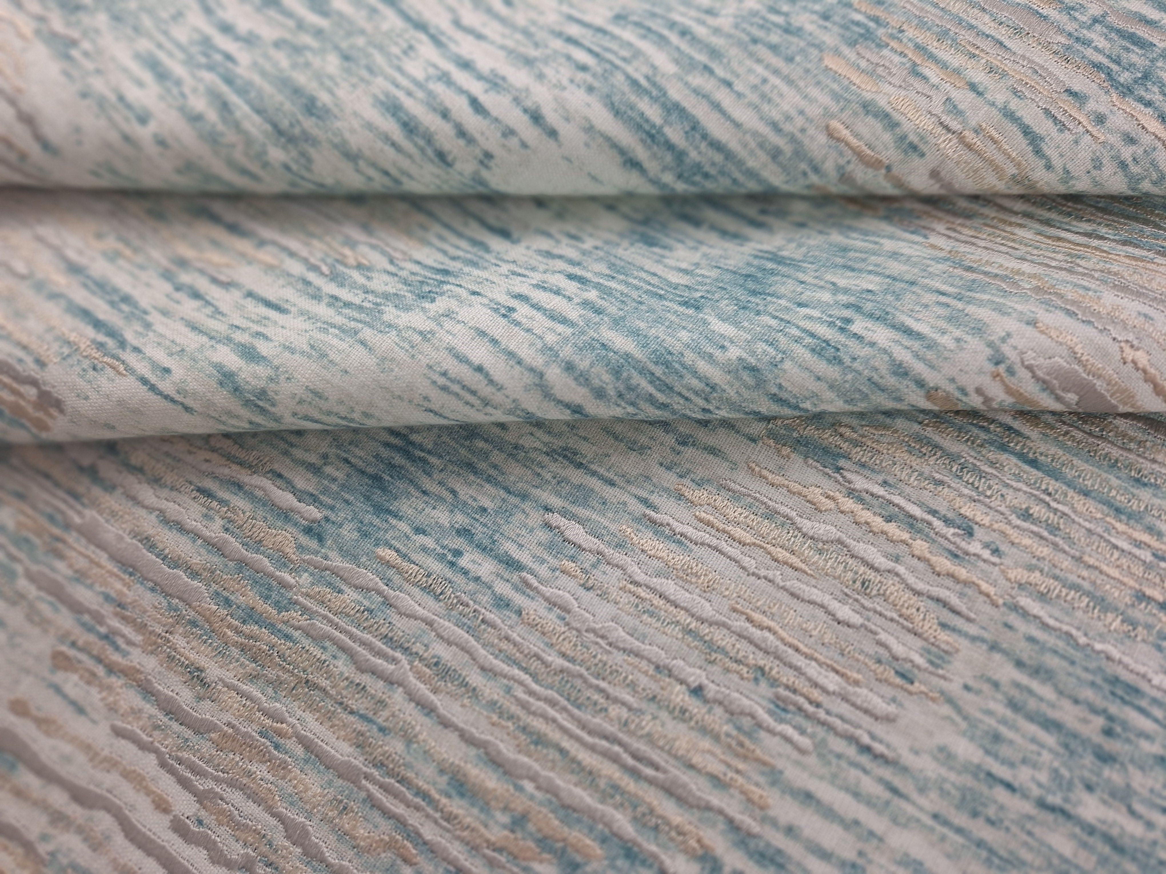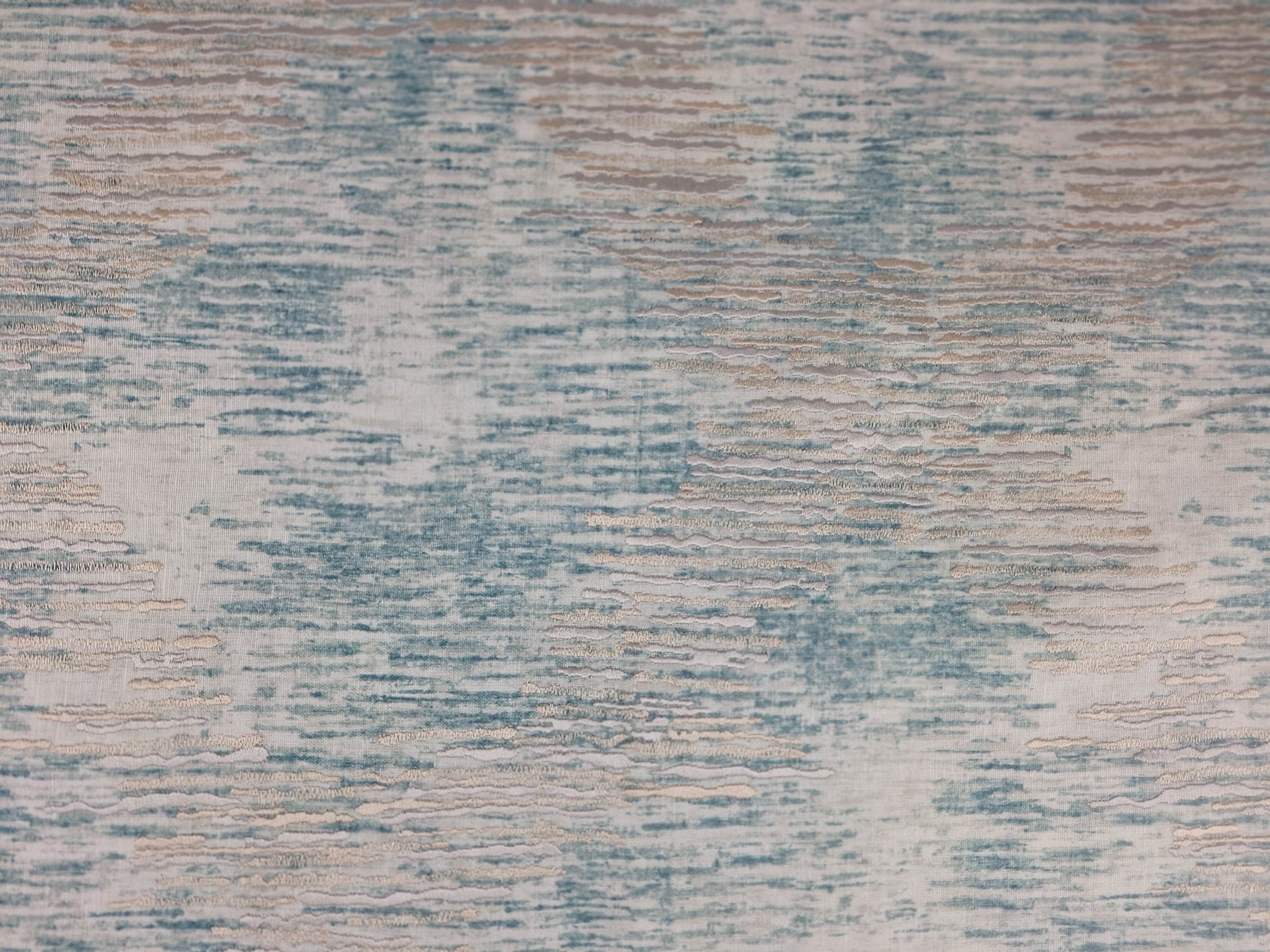 DESCRIPTION: Barbara Berry's Shimmersea Embroidered Fabric in Oasis features an embroidered, washed finish fabric with a elegant trellis embroidered design. The design features gold and silver tone embroidery on a teal and white fabric.