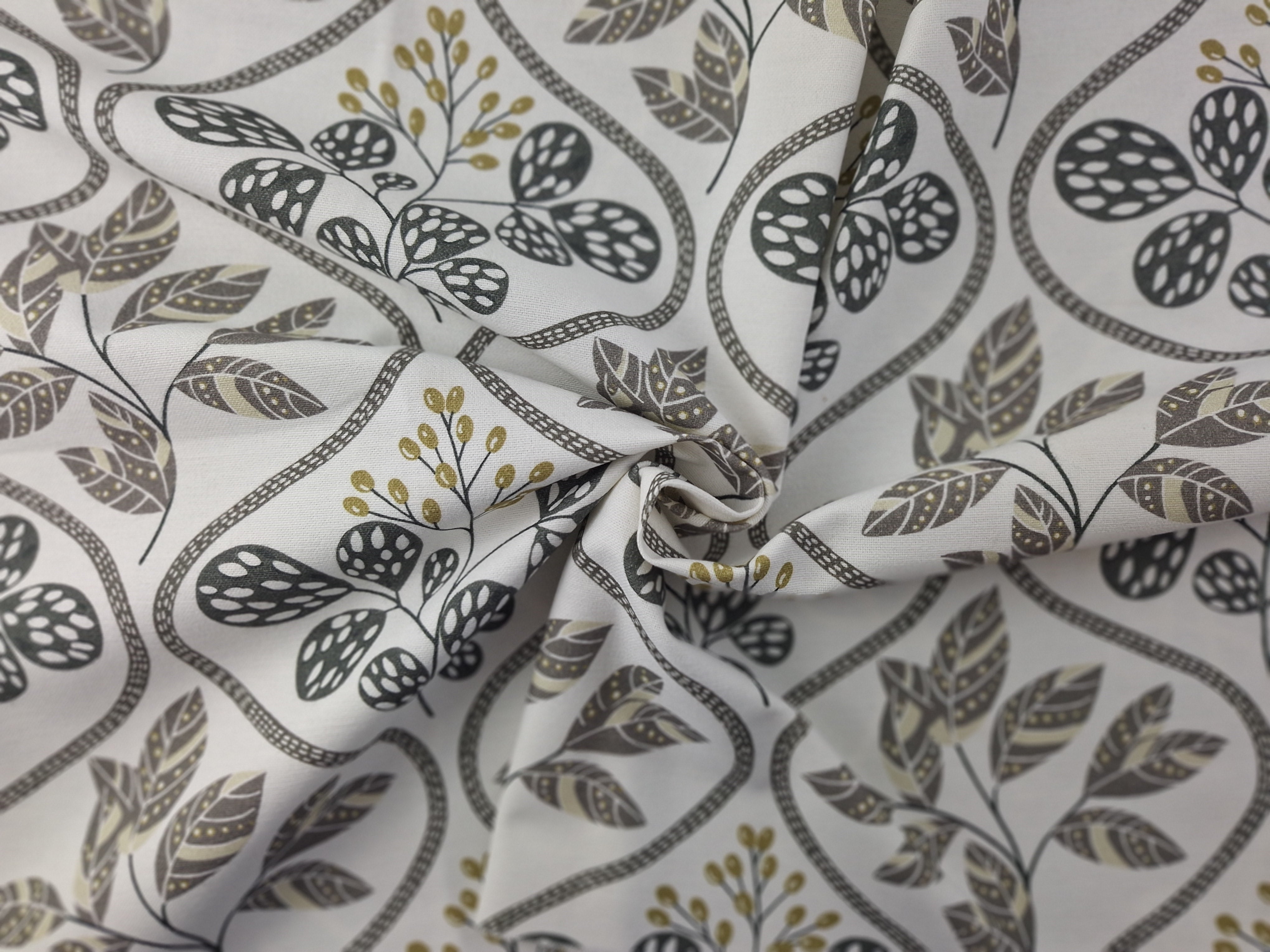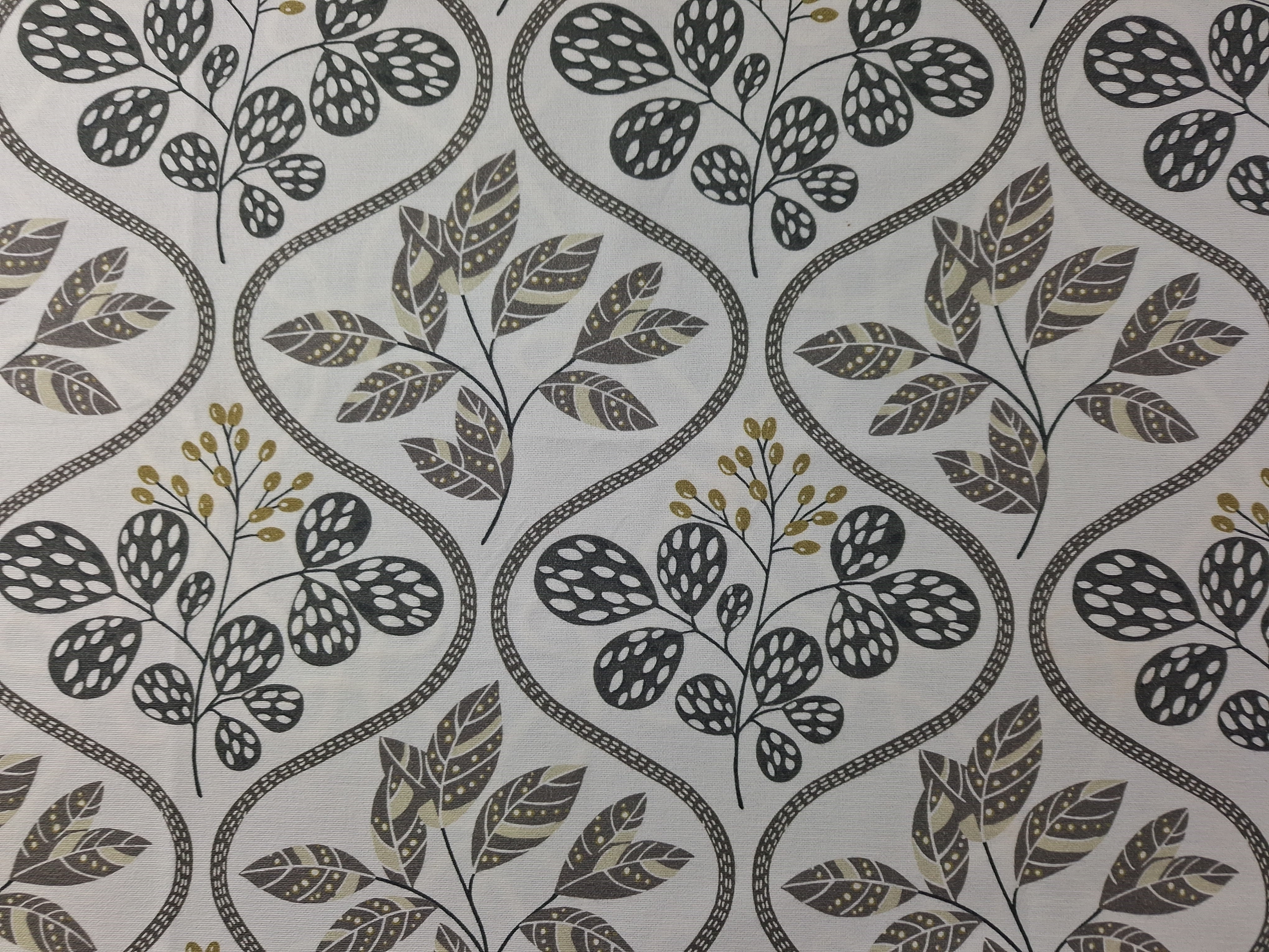 DESCRIPTION: Belle Maison Marnie Fabric in Crockery is a multipurpose fabric that features a botanical and ogee design. This fabric will add a touch of elegance and charm to your home décor. The color registration gunmetal grey, olive green, and basil green on a ivory colored background fabric.