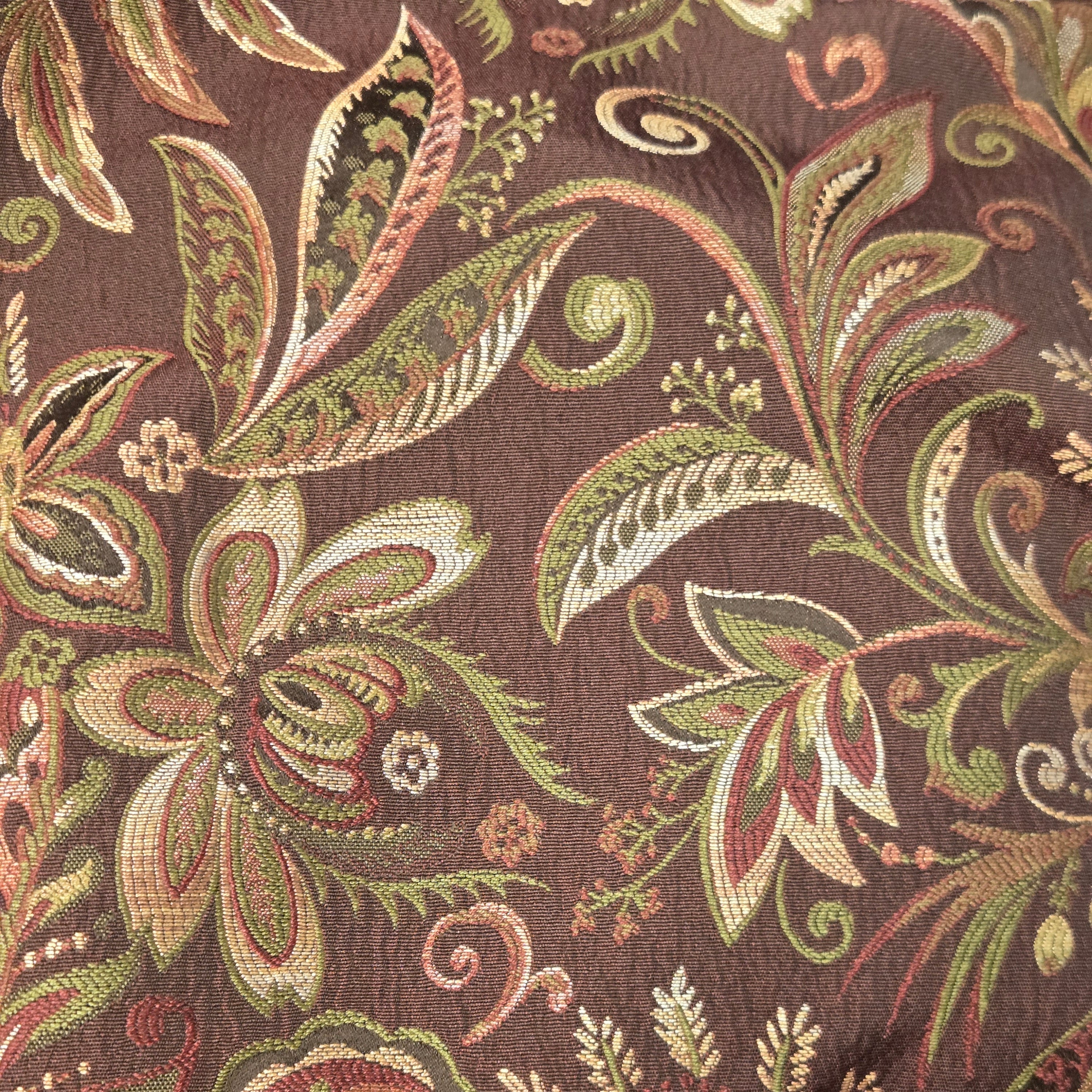 DESCRIPTION: This tapestry features a floral design. The color registration for this fabric shows cream, shades of green, paprika and rose on a brown colored background fabric.