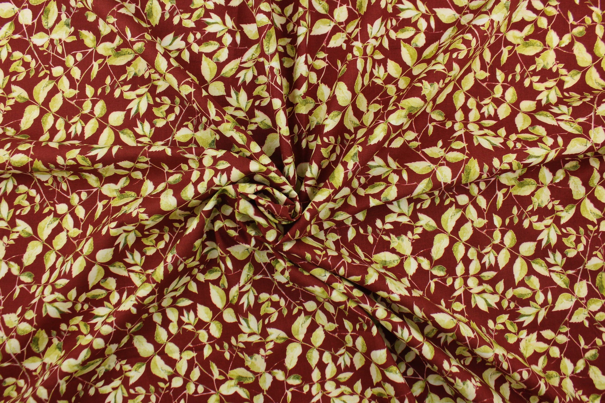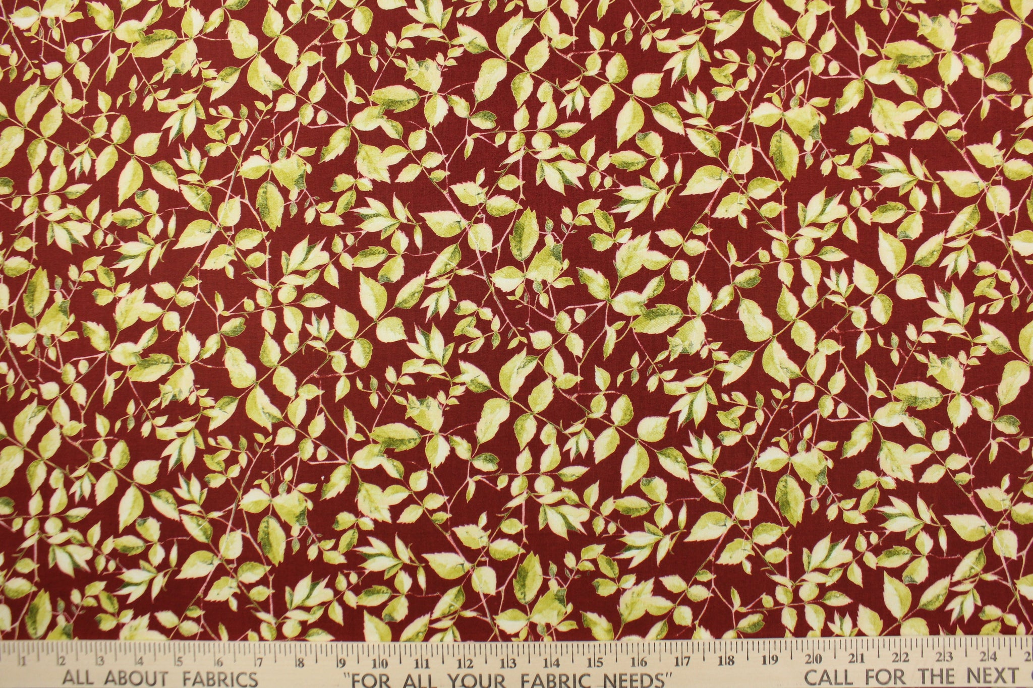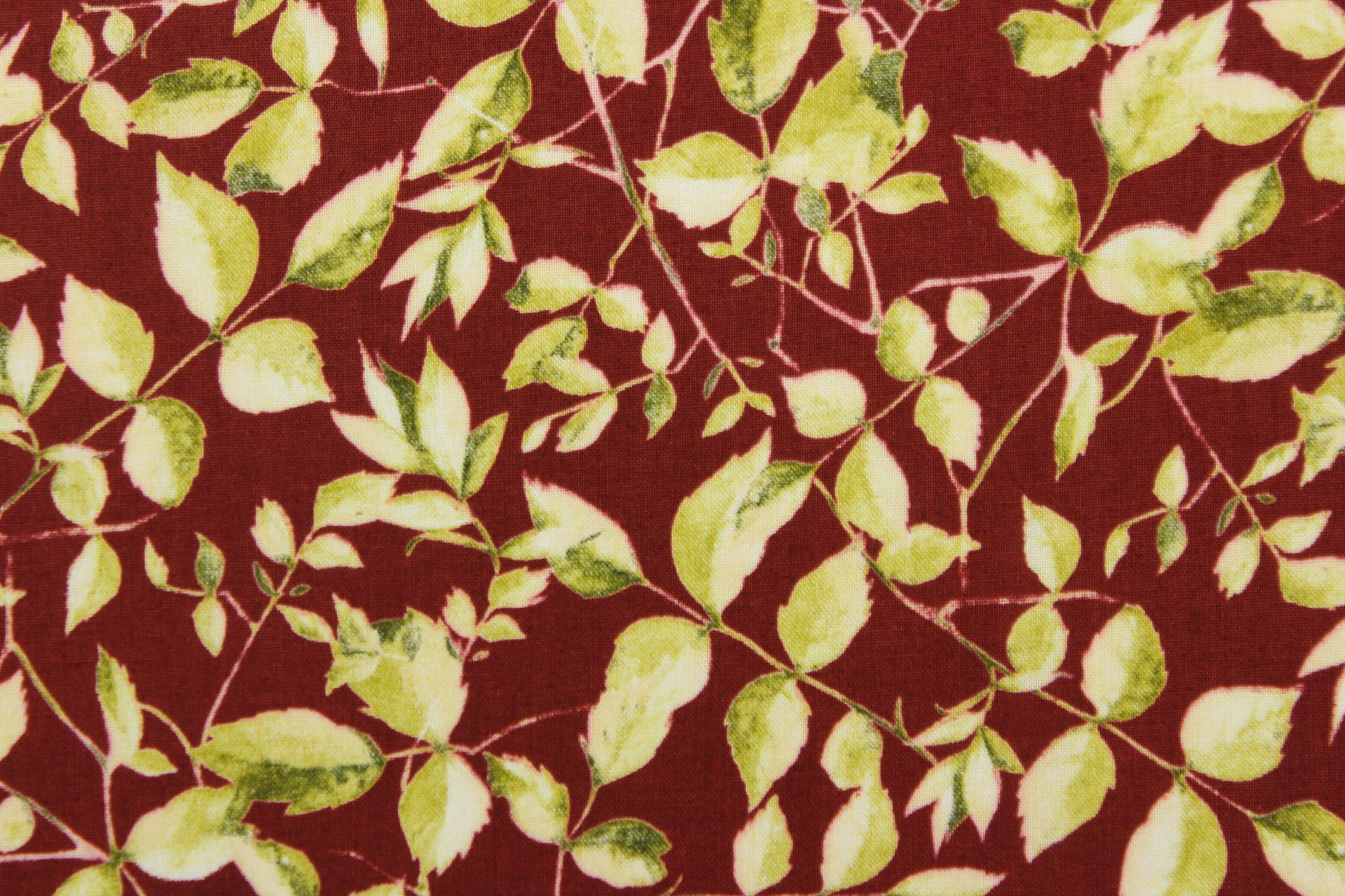 DESCRIPTION: This fabric features a leaf and stem design in light and dark green on a maroon background. It has a nice soft hand and would be great for quilting, crafting and home decor. We offer this fabric in several other colors.