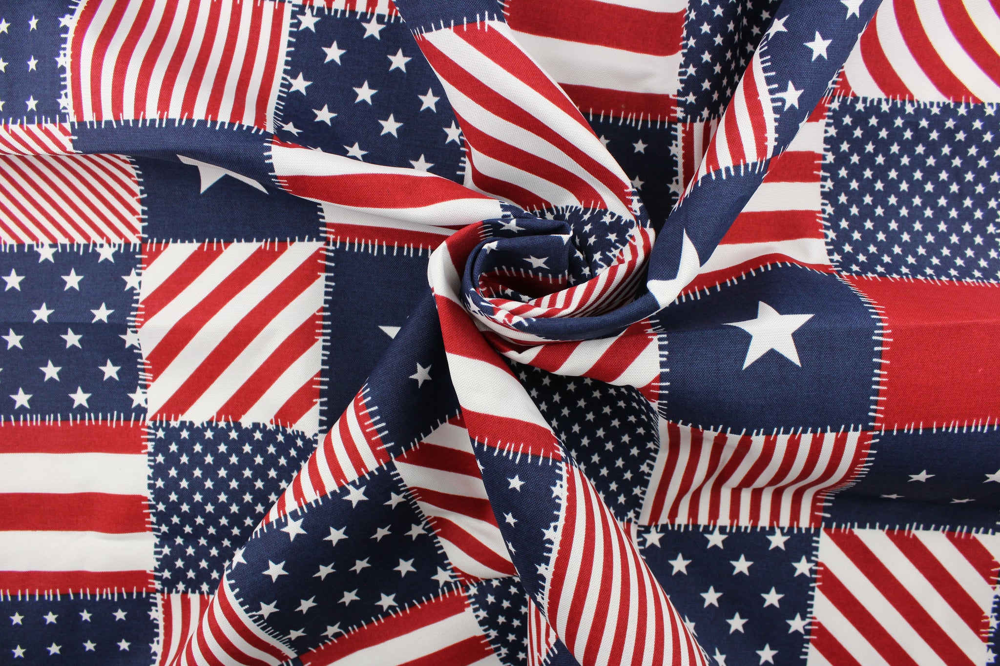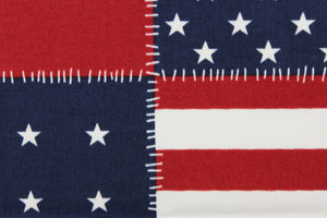 DESCRIPTION: Celebrate Independence Day with this patchwork patriotic print featuring stars and stripes, perfect for any project where the fabric will be exposed to the weather. Able to resist stains and water, UV tested and can withstand 500 hours of direct sunlight Uses include cushions, tablecloths, upholstery projects, decorative pillows and craft projects. This fabric has a slightly stiff feel but is easy to work with. Colors included are red, white and blue.
