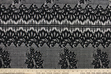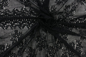 DESCRIPTION: This lace features a floral design in black with a stretch. Use this for apparel, overlays, and special events decor. We offer a wide variety of lace fabric.