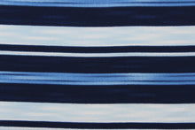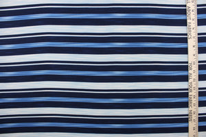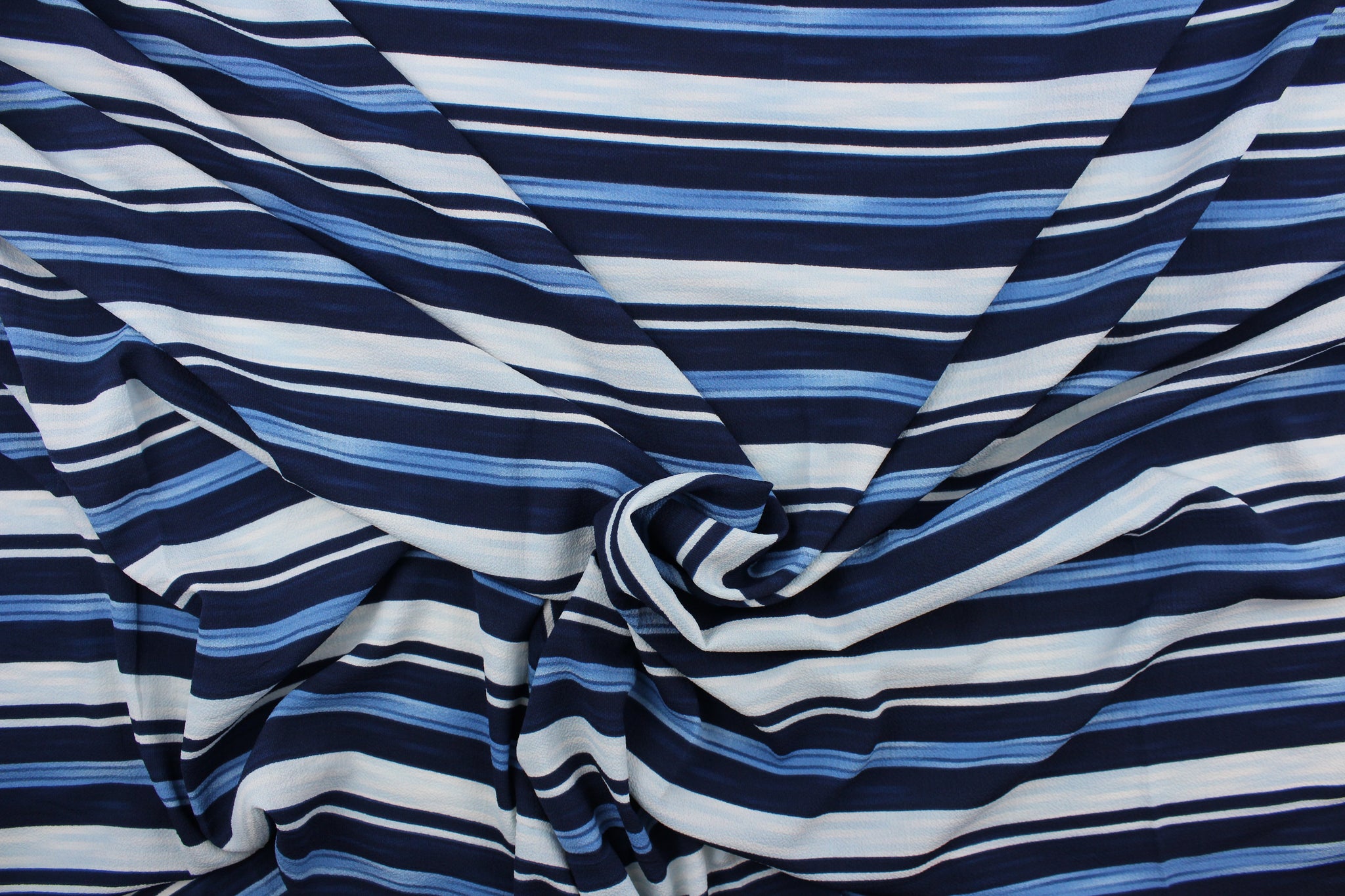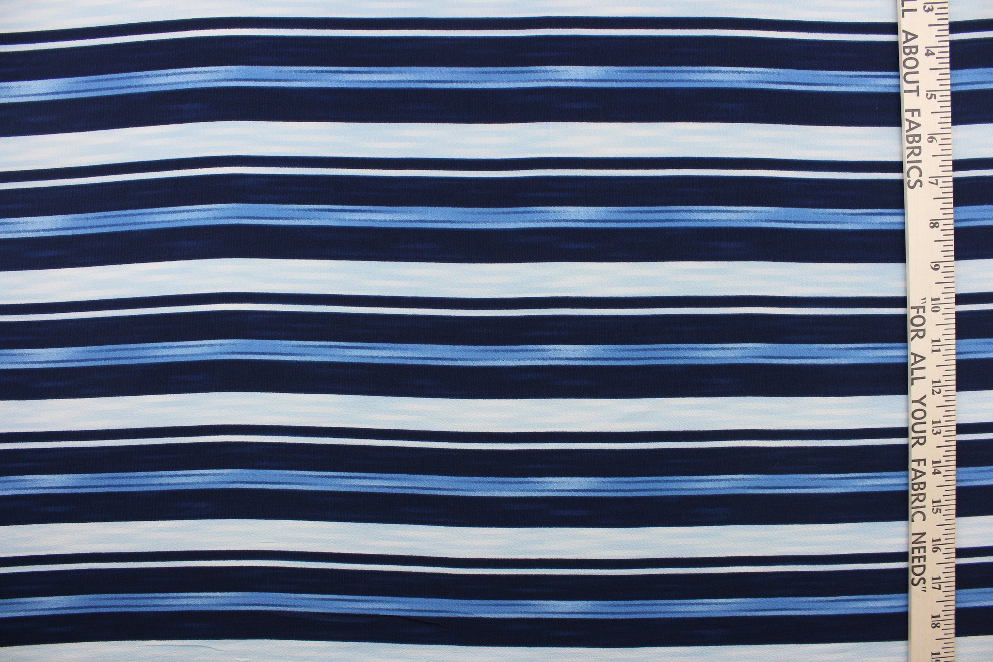DESCRIPTION: This georgette fabric features a stripe design in varying shades of blue and white. It is lightweight, breathable, semi-sheer and has a beautiful drape. Uses include scarfs, blouses, dresses, skirts, bandeaus, soft accessories and drapery sheers. Check out our other georgette fabrics.